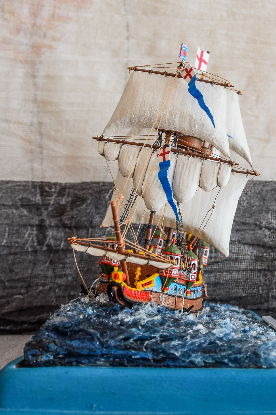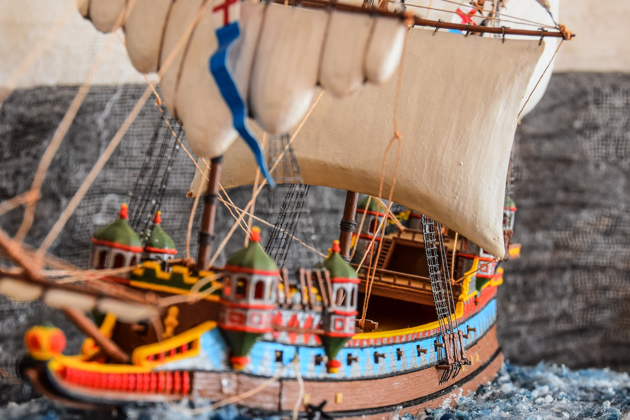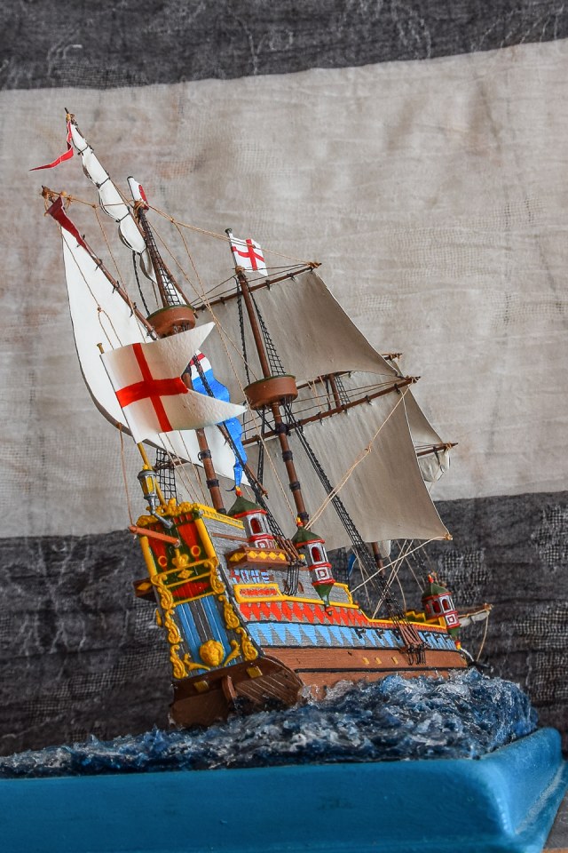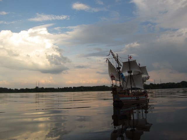 Этот корабль собираю уже второй раз,понравился он мне , на сборку ушло около шесть месяцев - каждый день понемногу. Потом появилась идея опустить его на воду, использовал сухой речной песок для балласта, больше часа сидел над ванной и проверяя как корабль держится на воде, в итоге выдерживает малые волны на озере и не переворачивается.