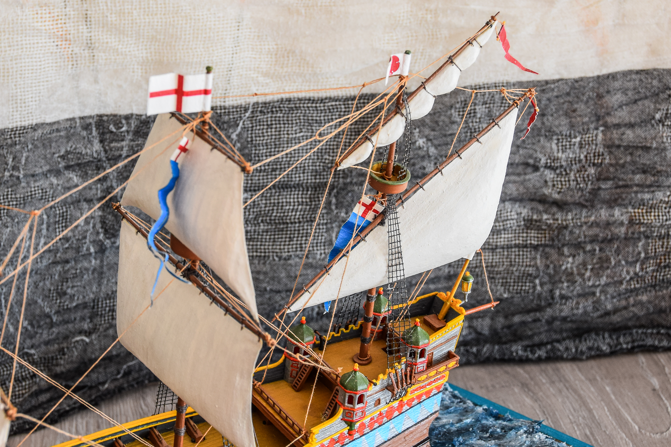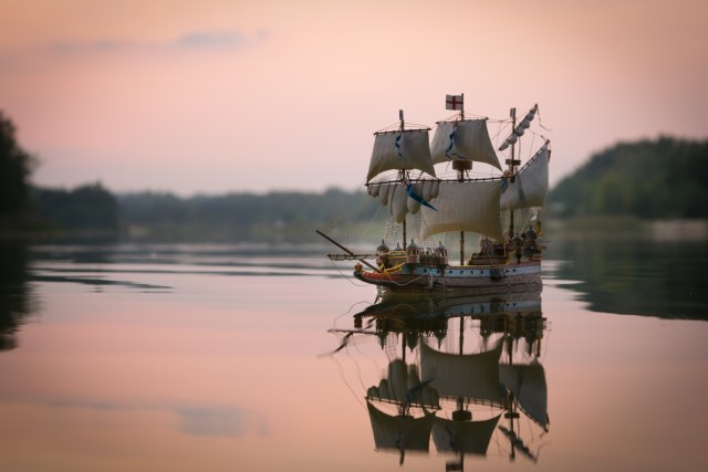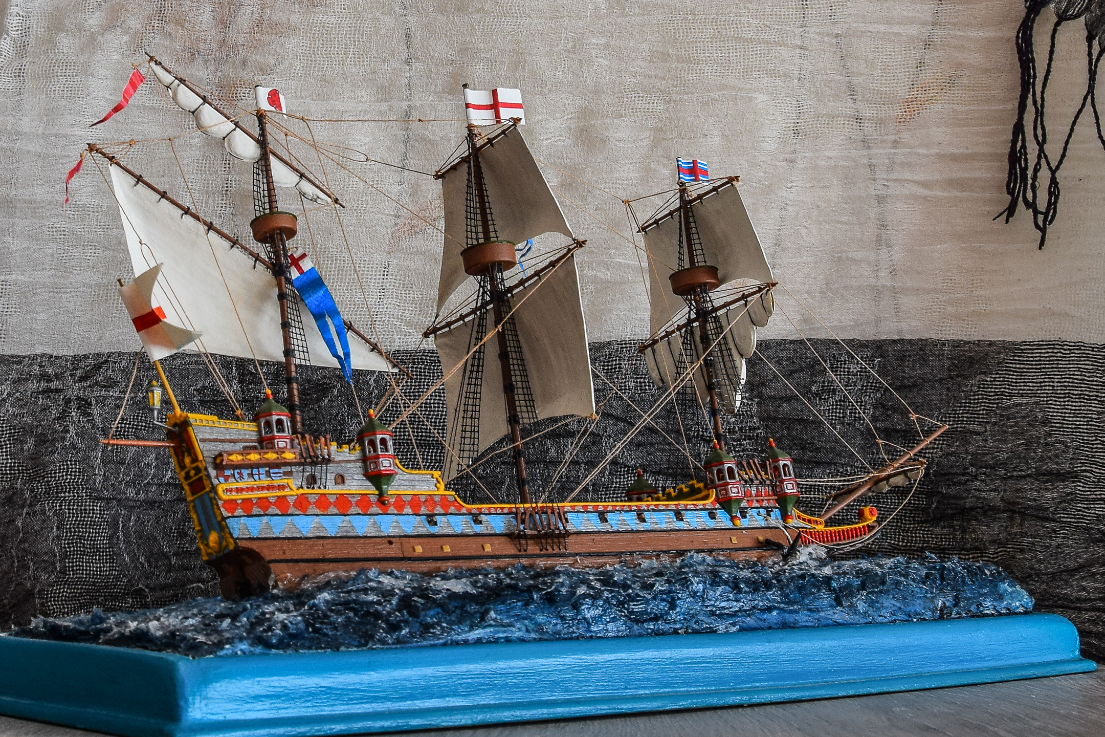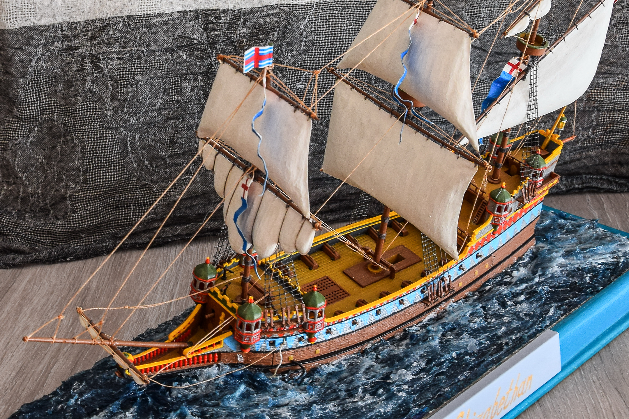 Этот корабль собираю уже второй раз,понравился он мне , на сборку ушло около шесть месяцев - каждый день понемногу. Потом появилась идея опустить его на воду, использовал сухой речной песок для балласта, больше часа сидел над ванной и проверяя как корабль держится на воде, в итоге выдерживает малые волны на озере и не переворачивается.