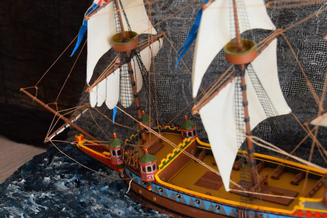 Признаюсь честно.При дальнейшем просмотре фотографий,был разочарован. Кораблик похож на торт. Говорить о деталировке даже и не буду.Такая может только для 350го масштаба могла бы пойти.Хотя в вантах,вант-путенсах, юферсах, да и в такелаже сооооовсем немного,но понимаю.)) Покраска не аккуранта.Пушки не просверлены.На некоторых деталях швы не просто видны а попросту наверное даже не зачищались. Как по мне модель только для песочницы.