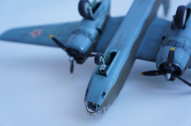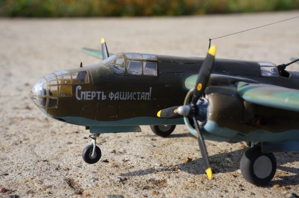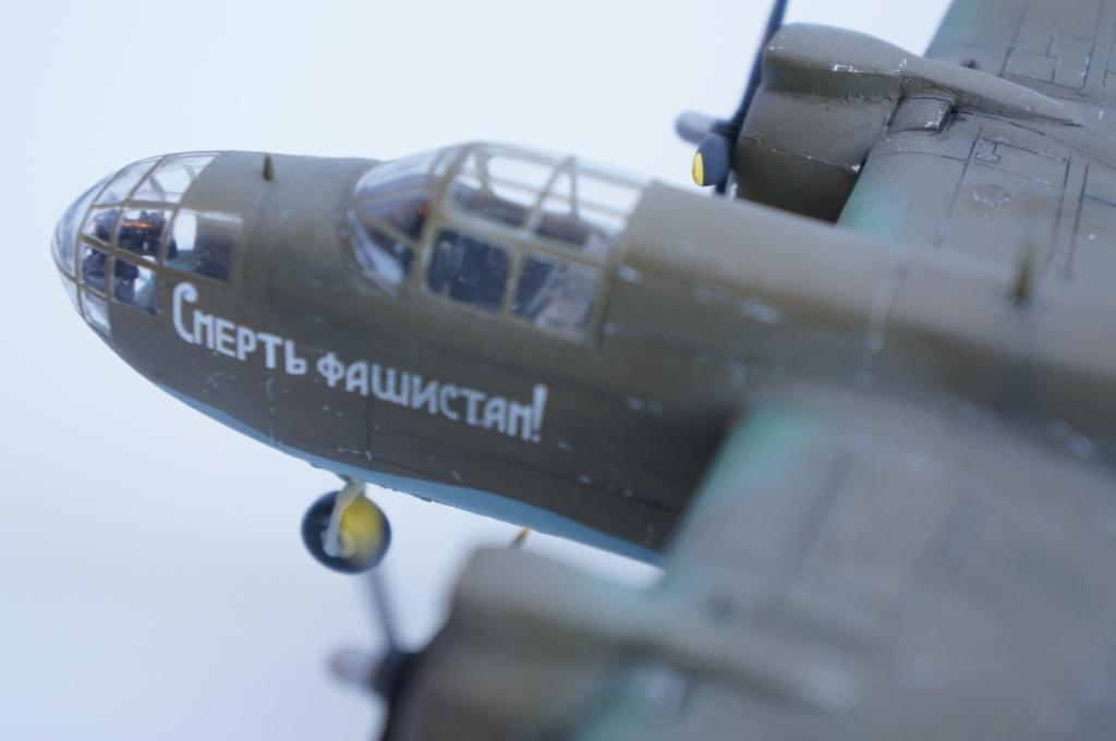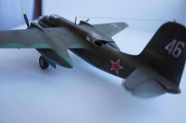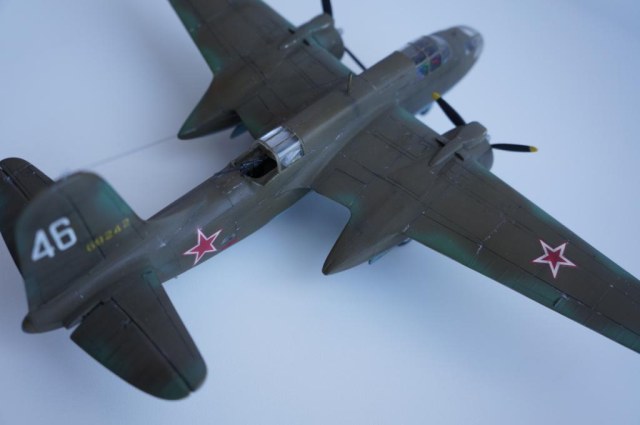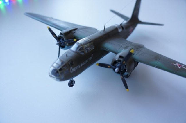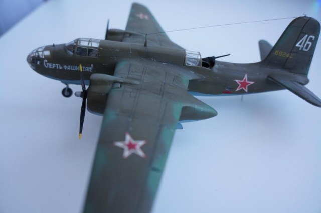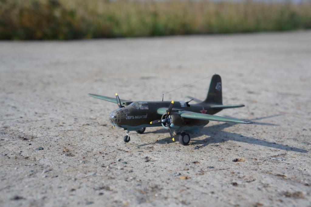 Доброго времени суток! Выставляю на Ваш суд мою очередную работу,модель американского легкого бомбардировщика А-20В Бостон от фирмы МРМ.Изначально хотелось собрать советский вариант этого самолета,чем собственно я и занимался почти два месяца.Конкретного прототипа данного борта нет ,образ скорее собирательный ,но вполне допускаю что самолет с такой раскраской и надписью на борту мог существовать.Что касается самого набора к сожалению он не порадовал качеством.Толстый пластик,крученый винтом фюзеляж,плохая стыкуемость отдельных деталей,толстая расшивка делали сборку не забываемой!Больших доработок в модели не делал,не много изменил интерьер кабины, переделал ПНШ,,открыл кабину стрелка сделал станину под пулемет,проработал двигатели обклеил капоты фольгой,отклонил стабилизатор.Все попытки облегчить хвостовое оперение и утяжелить нос к успеху не привели,самолет завалился на хвост!Красил акрилом от Тамия, декали из старых запасов,сколы наносил сухой кистью обклеенные фольгой капоты не много ободрал,при загрязнении использовал пастель . Вариат камо американский,жалею что не сделал следы от закрашенных опознавательных знаков.Всем приятного просмотра!