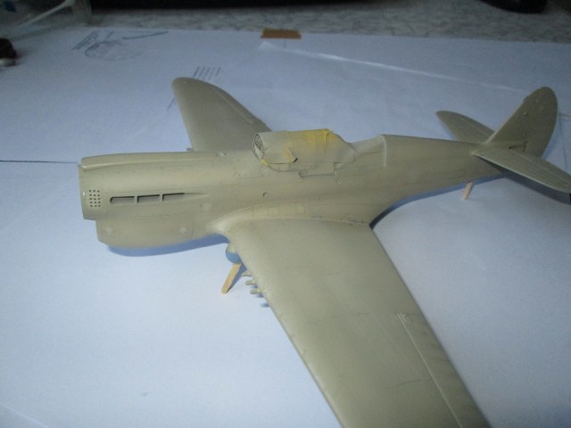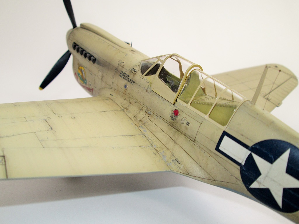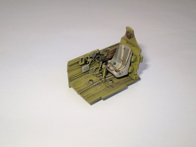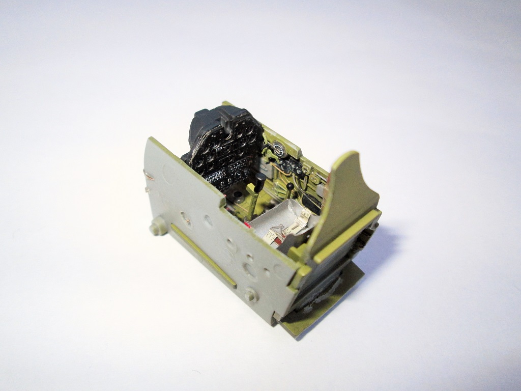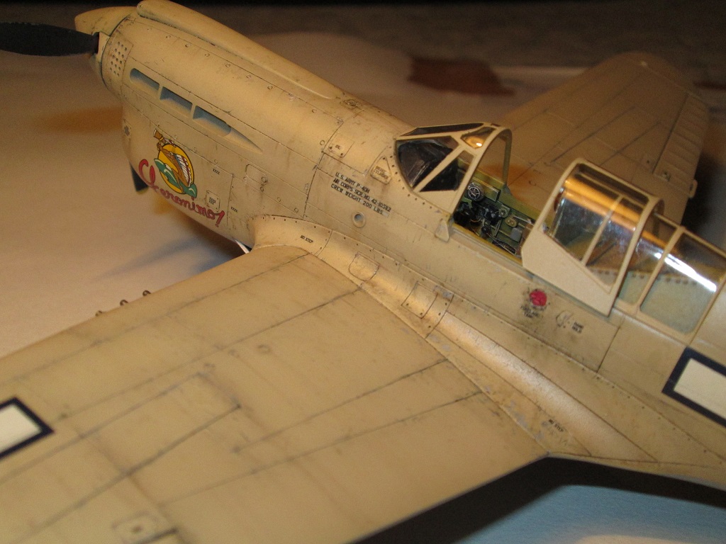 Кок винта плохо стыкуется с фюзеляжем, в 48-ом, да ещё и на светлом камуфляже очень бросается в глаза. Передняя част фонаря кабины сидит "удовлетворительно", очень заметны огрехи по лобовой части. Цвет переплёта фонаря сильно контрастирует с остальной моделью(краска сильно чистая). Огромные заклёпки в кабине.