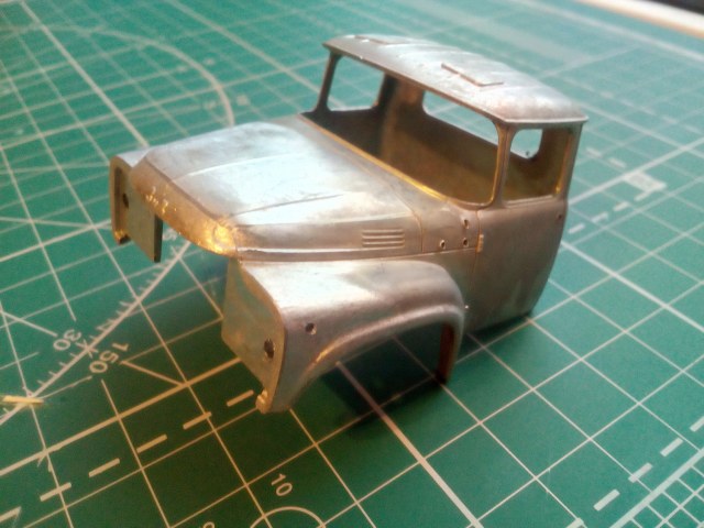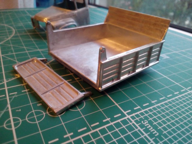В наборе традиционная металлическая кабина, а так же дан металлический кузов. Задний борт дан отдельно, видимо для возможности сделать модель с поднятым кузовом и откинутым бортом.