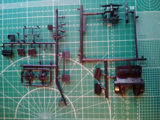 Коробка с верхней загрузкой, по сравнению с набором ЗиЛ-157 заметно подросла.Внутри литники черного цвета, упакованные в пакеты, так же прозрачный литник и покрышки.