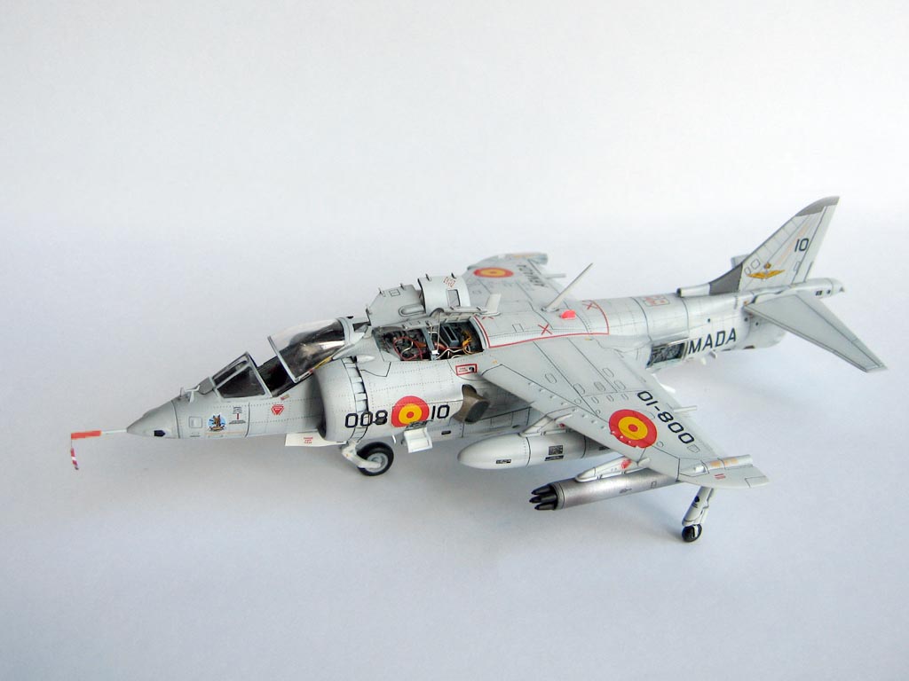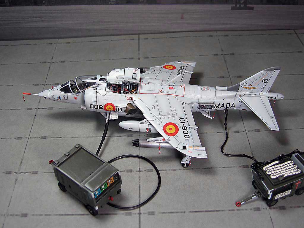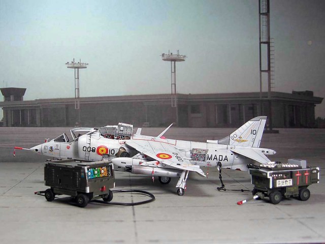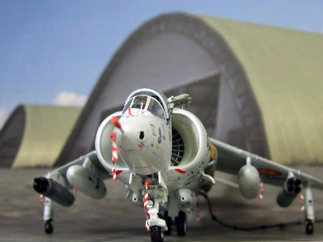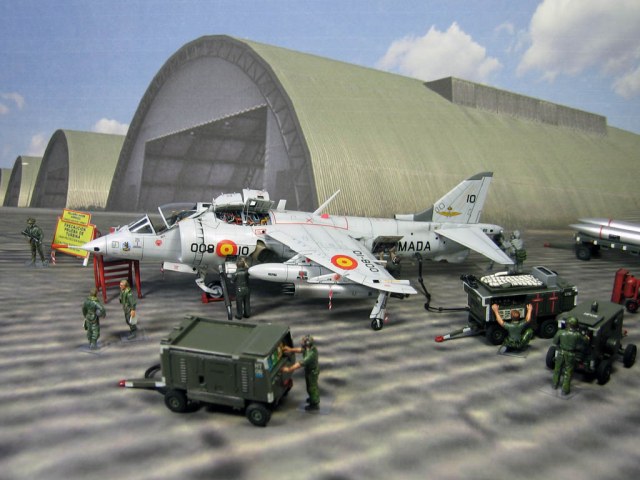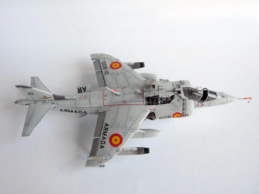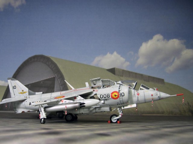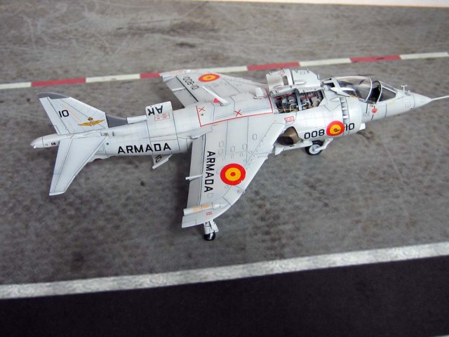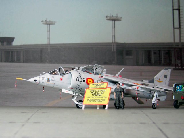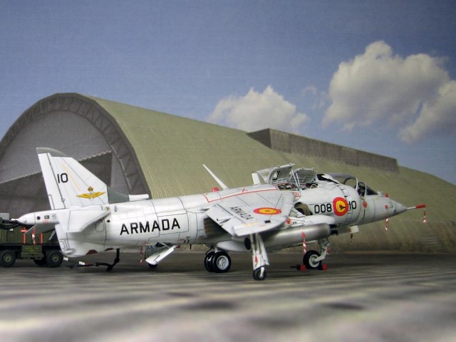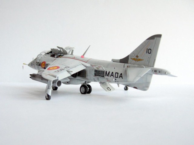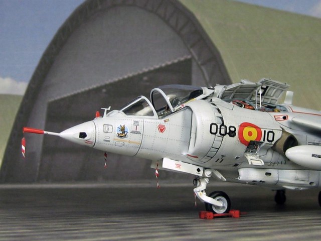 Модель фирмы AIRFIX самолёта вертикального взлёта и посадки HawkerSiddeleyHarrier AV-8A. Одним из покупателей данного самолёта была Испания. В 1972 году были впервые осуществлены взлёт и посадка на испанский лёгкий авианосец «Дедало». И затем, в скором времени, испанские ВМС закупили самолёты, разработанные для корпуса морской пехоты США. Английское обозначение испанских бортов HarrierMk 55, американская же модификация именовалась AV-8S. В Испании самолётам присвоили испанское обозначение VA.1 MATADOR.