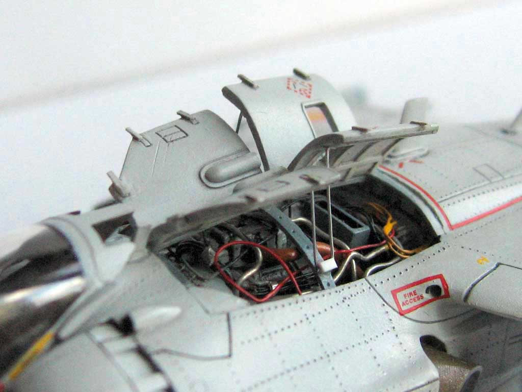 - На спине планера за фонарём кабины сделал открытым отсек двигателя Пегас с поднятыми капотами и имитацией самого двигателя и вспомогательной силовой установки для запуска основного двигателя,