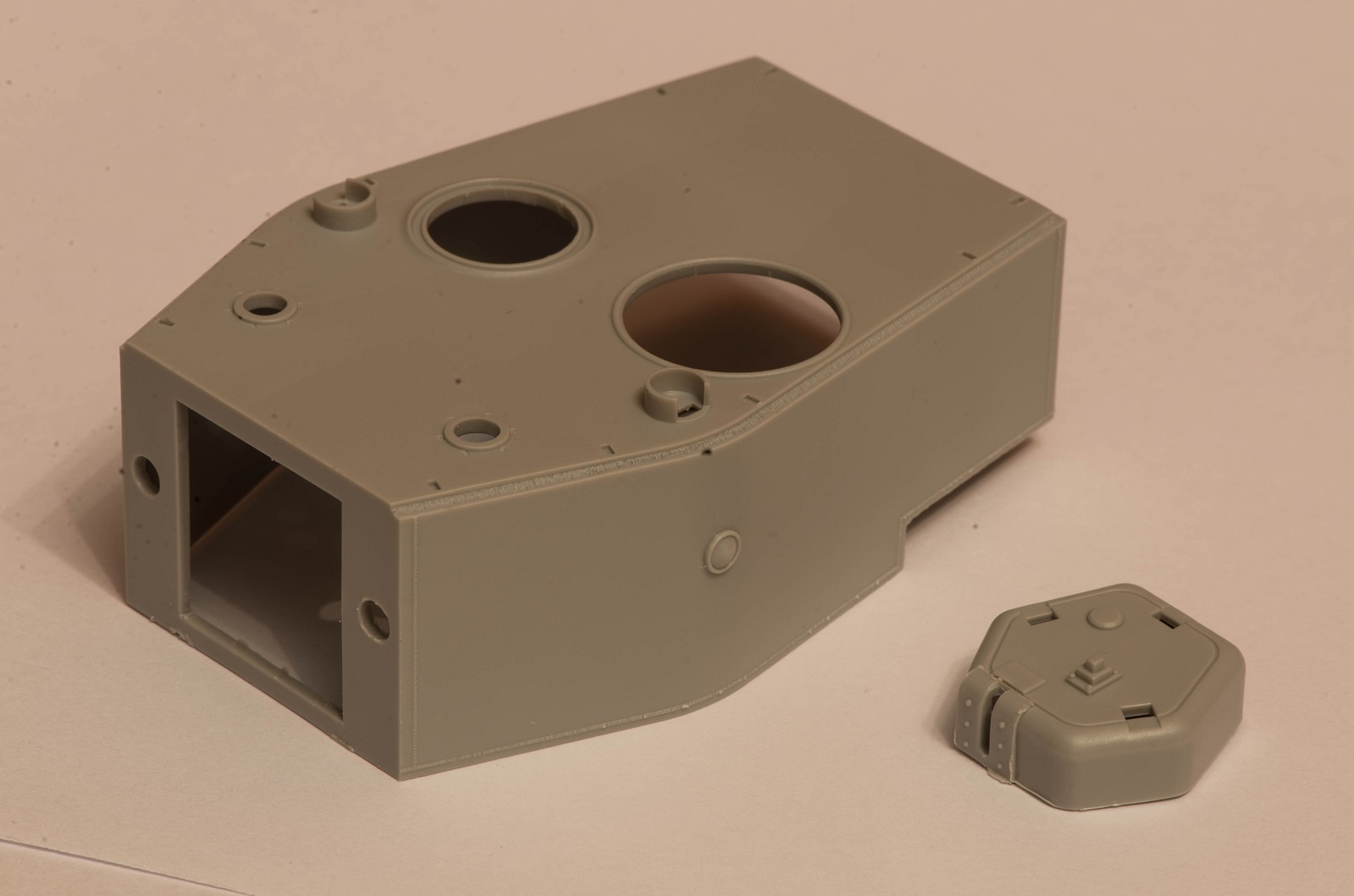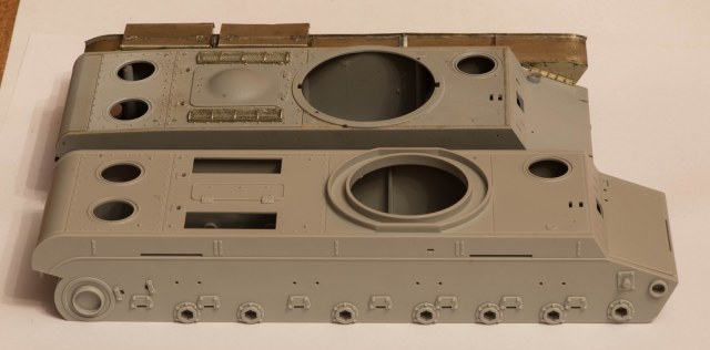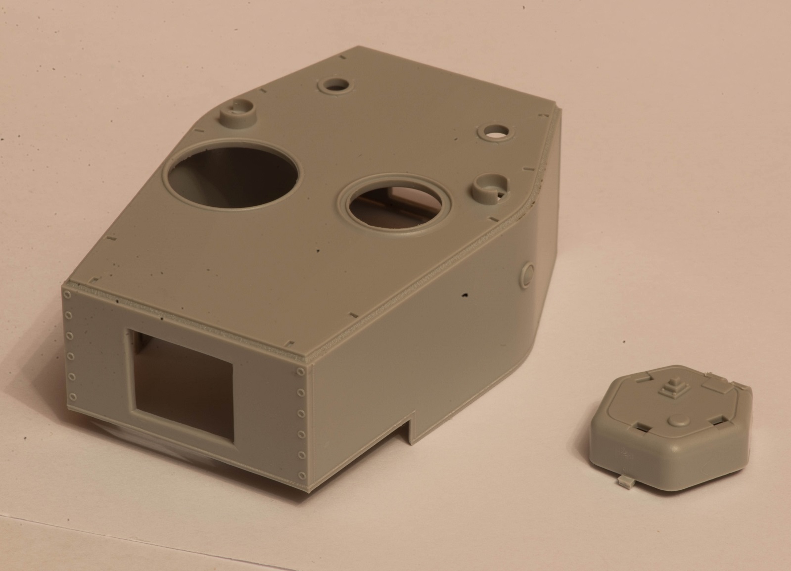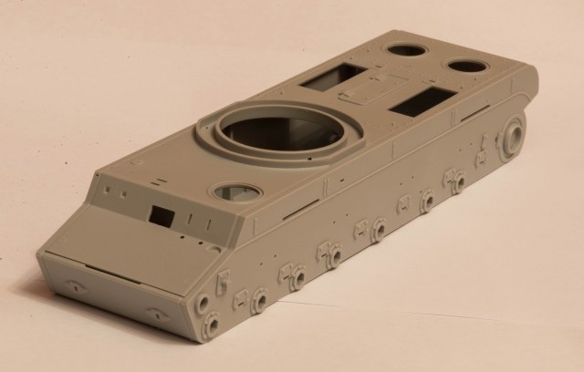 Рад, что пригодился). Сам раздумываю теперь над тем, чтобы продать его. Либо попытаться создать чертёж крыш МТО и передней части крыши корпуса (с круглым люком мехвода) и заказать на лазерную резку из пластика, вырезав отверстия нужного диаметра в них и вставив туда скопированные и размноженные в смоле от ранних Трумпетеровских КВ-1 кольца креплений этих люков. Но это актуально для корпуса, с башней же могут возникнуть бОльшие проблемы в этом плане. Впрочем, я всё равно собирался делать КВ-220 с башней от серийного КВ-1. Можно было бы просто расчертить циркулем кольцо на уже имеющихся крыше корпуса и башни, но я не знаю как можно точно отмерить середину круга в пустом пространстве люка и разместить там ножку циркуля. А ошибка здесь недопустима. P.S.: Если вы захотите тоже сделать такой вариант машины, то учтите, что крепления башен к погону у КВ-220 и КВ-1 Трубача различны и придётся заморочиться изготовлением переходника.