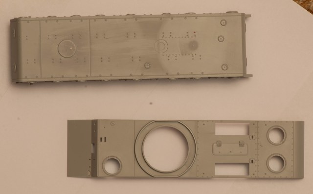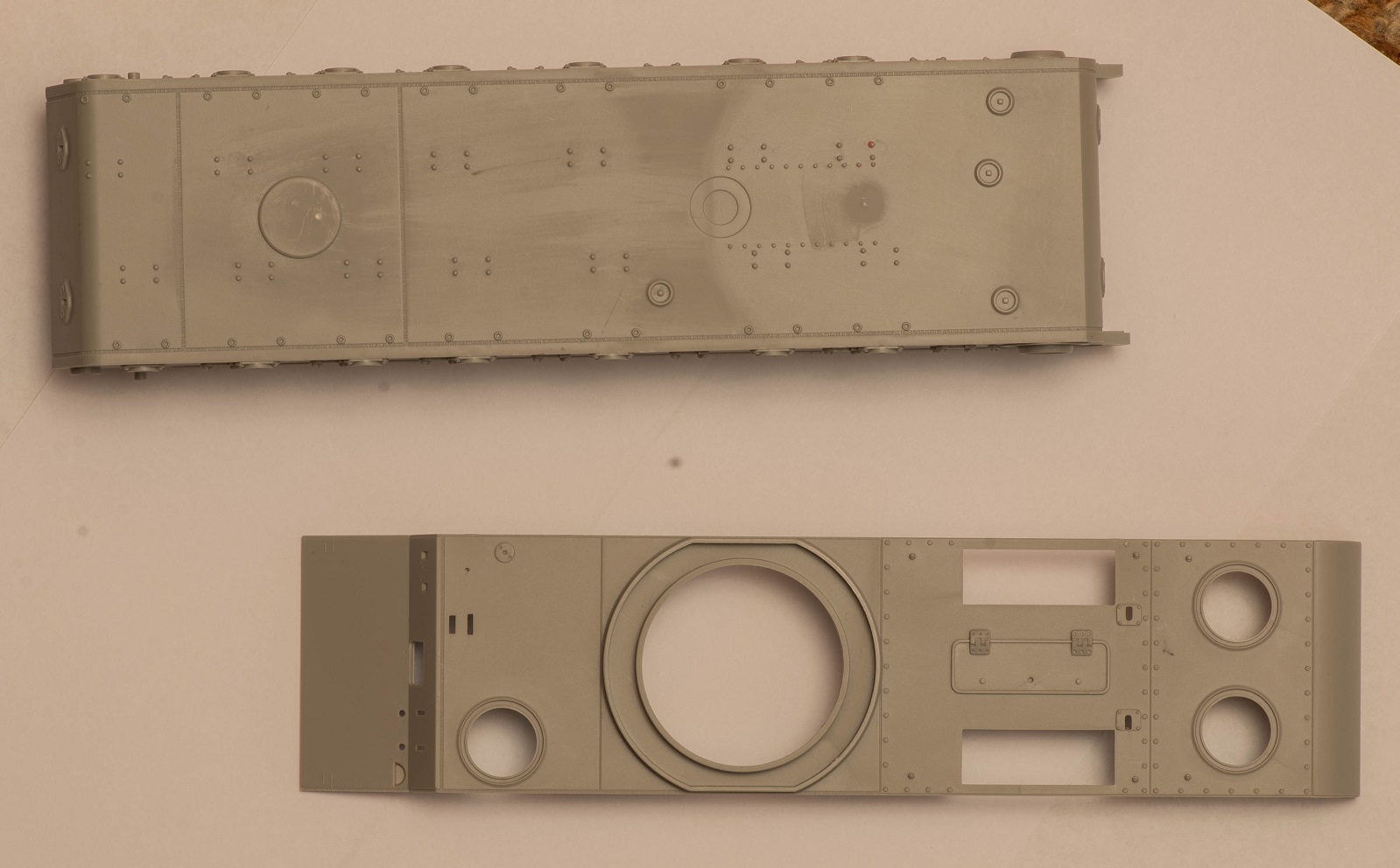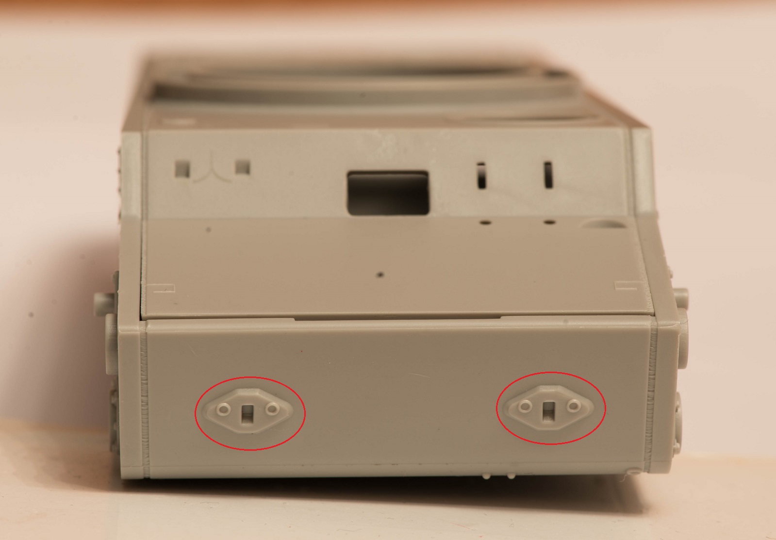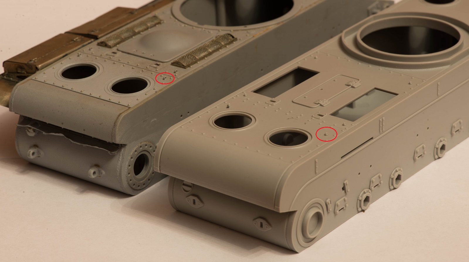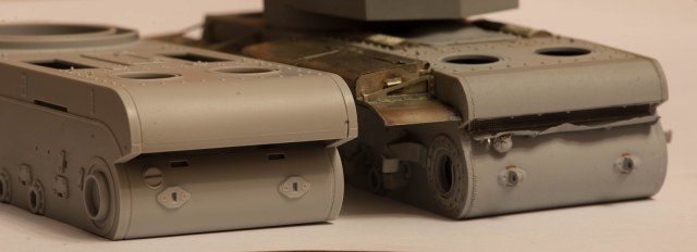 4) Не понравились гужоны. Выполнены какими-то идеально круглыми и гладкими кольцами, а в реальности ведь это была весьма грубая обварка. На таранном уголке при этом умудрились Трубачи сделать здоровую ступеньку от пресс-формы прямо на лицевой стороне детали. Подобная же ступенька присутствует и на передних частях надгусеничных полок.