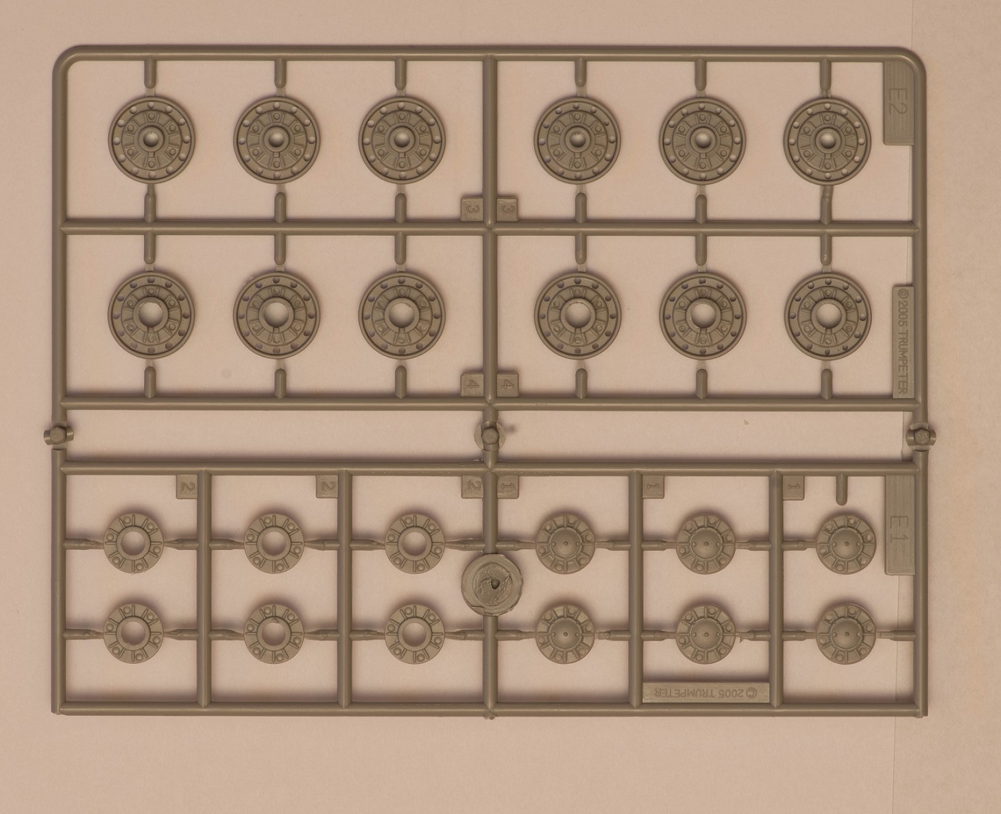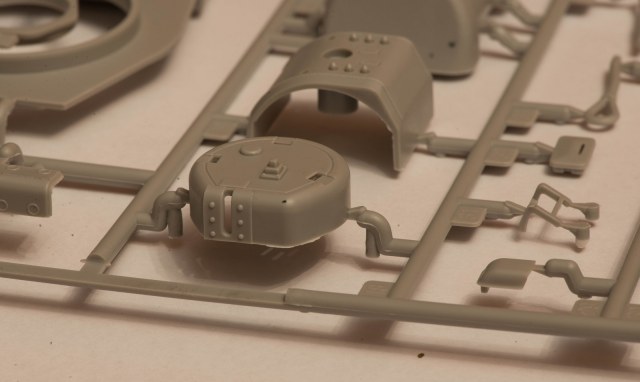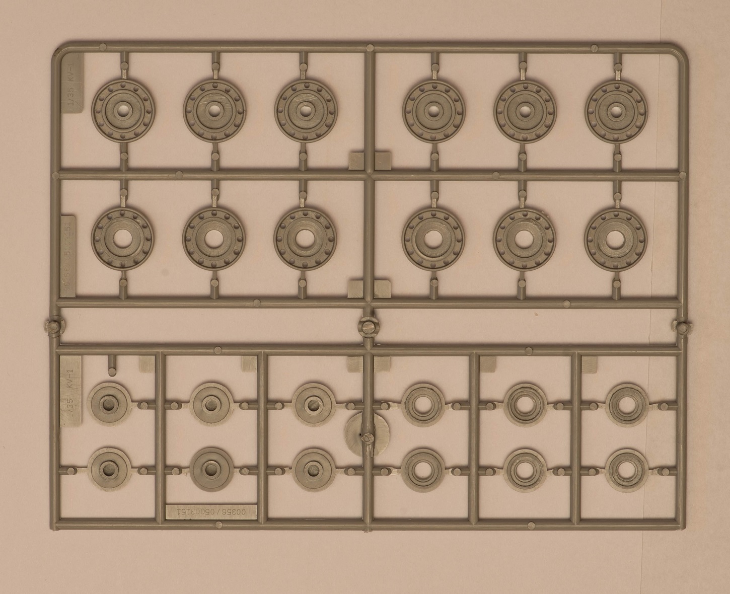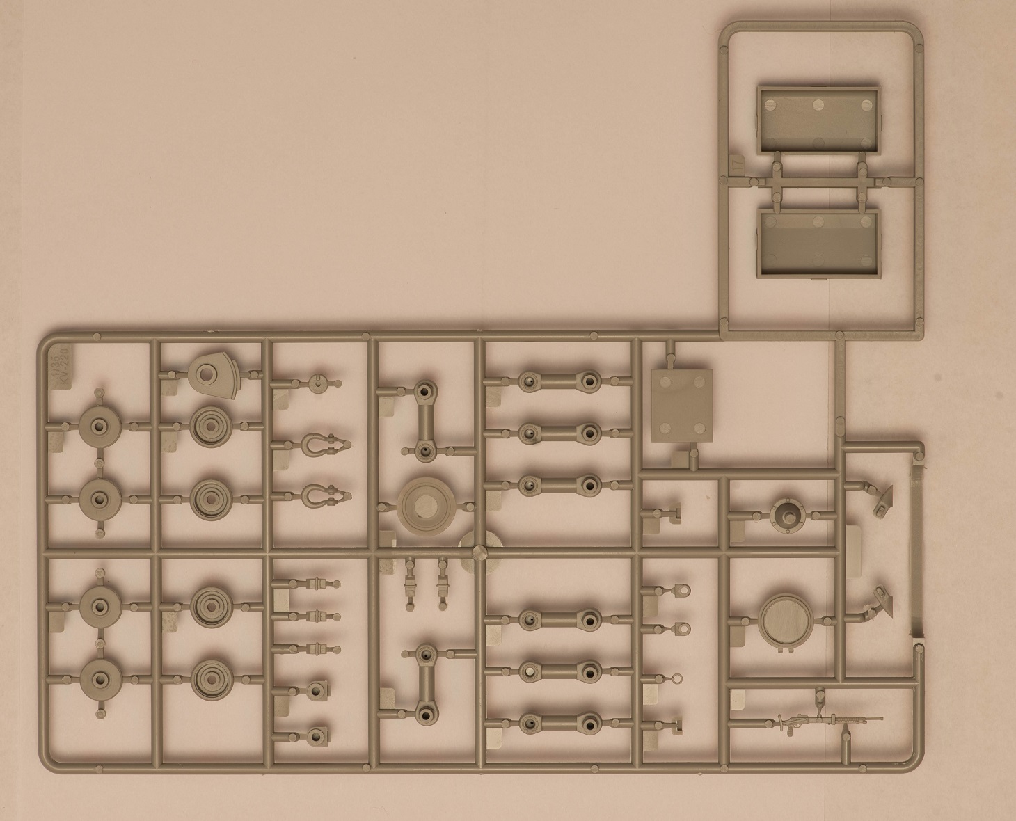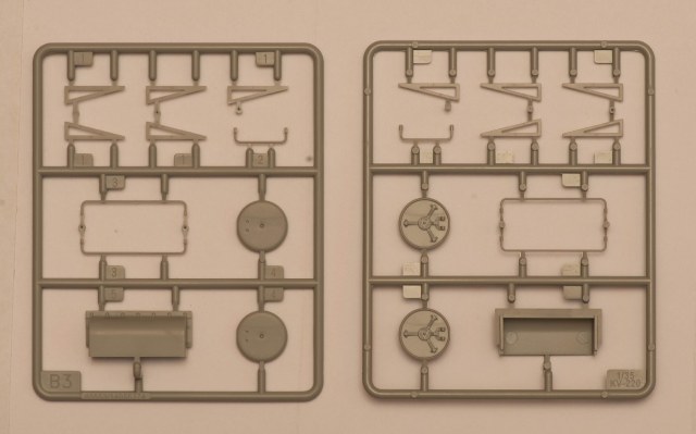 2) В наборе даны 2 литника с деталями, как я понял, от КВ-5. за счёт этого у вас в запасе останется 2 выхлопных патрубка весьма хорошего качества, в отличие от такового на линейке ранних КВ того же Трубача, которые страдают разной толщиной стенок. На фото это не очень заметно, т.к. присутствует небольшой облой.