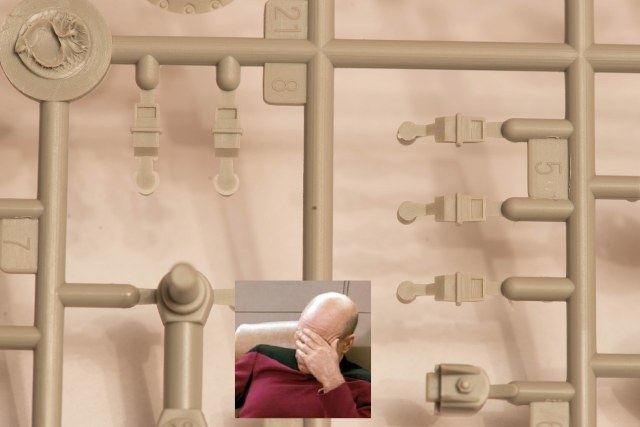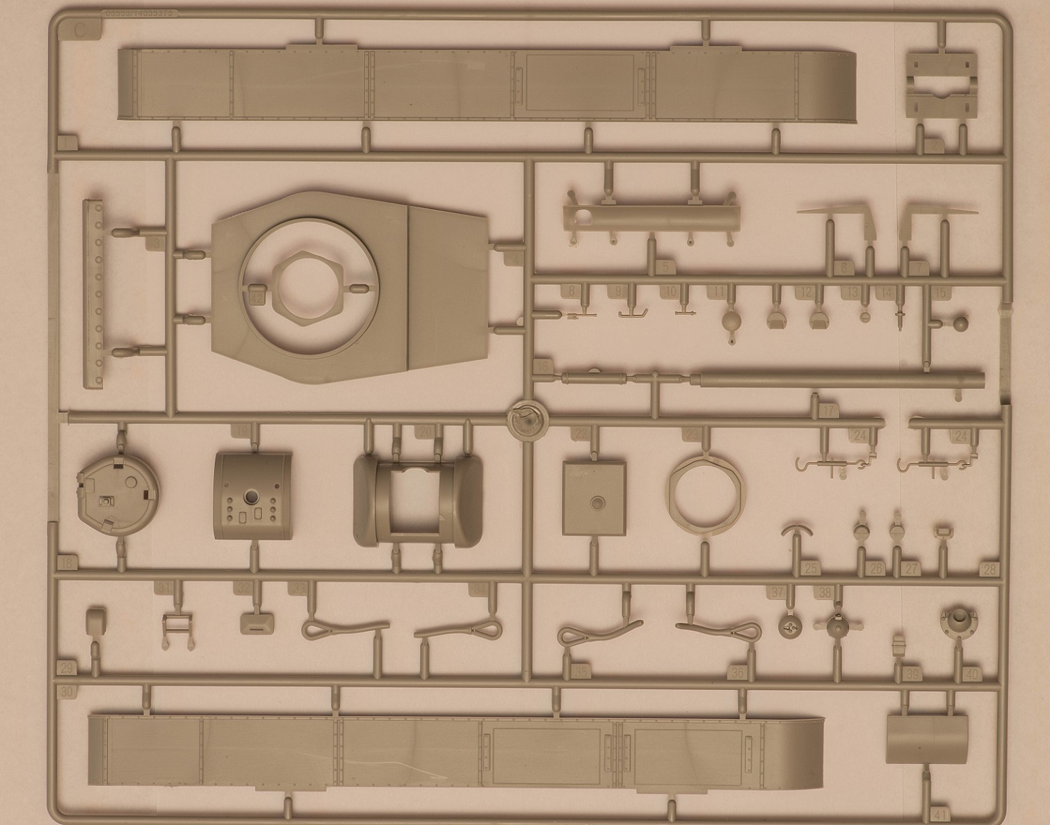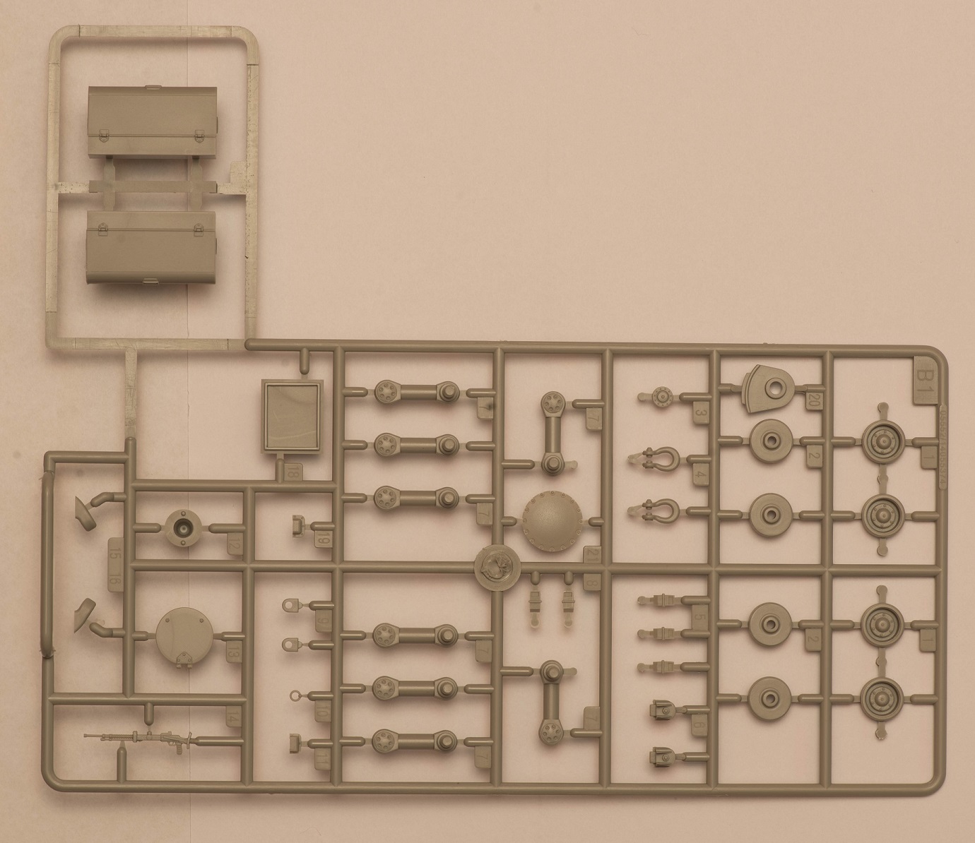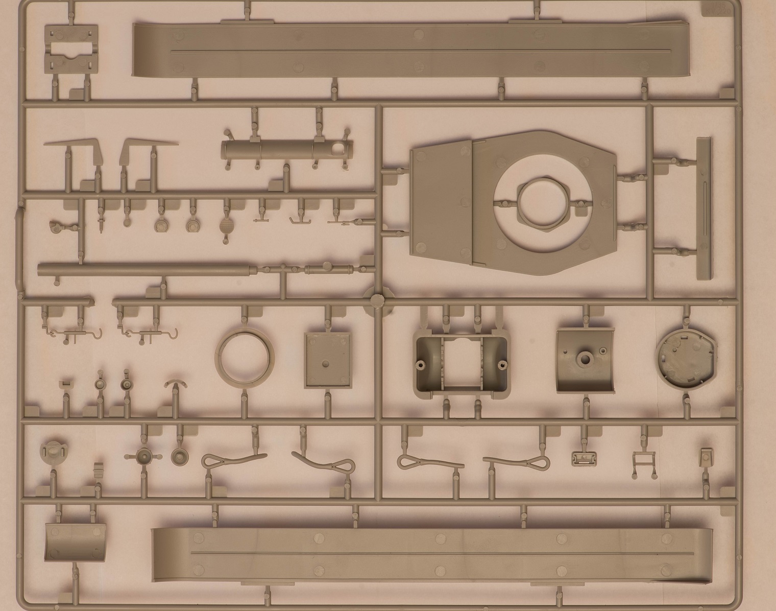 2) В наборе даны 2 литника с деталями, как я понял, от КВ-5. за счёт этого у вас в запасе останется 2 выхлопных патрубка весьма хорошего качества, в отличие от такового на линейке ранних КВ того же Трубача, которые страдают разной толщиной стенок. На фото это не очень заметно, т.к. присутствует небольшой облой.