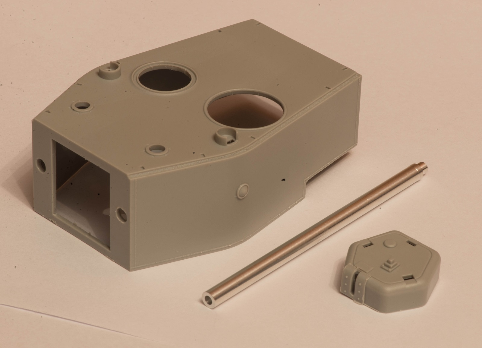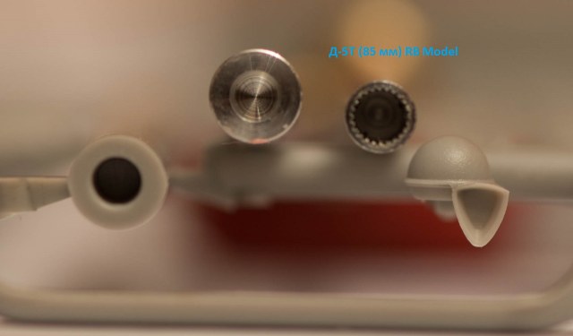 3) Ствол орудия, как пластиковый, так и металлический, помимо отсутствия нарезов, имеет чудовищно толстые стенки. На одном из фото приложил для сравнения ствол от Д-5Т RB Model того же калибра. Если хотите это изменить, то можете попробовать расточить пластиковый из набора, благо он дан моноблоком. Либо ждать когда кто-то из производителей афтермаркета выпустит нормальный.