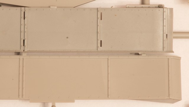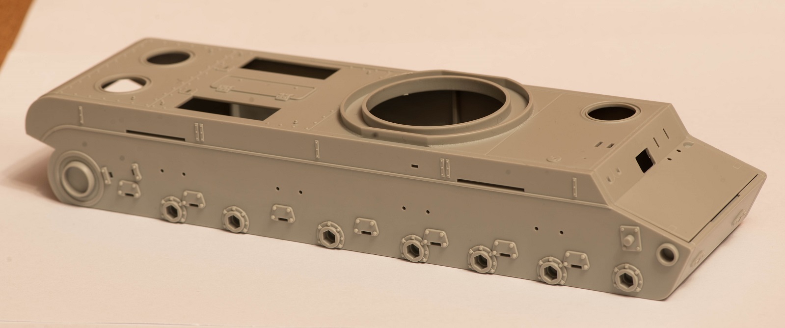 1) Надгусеничные полки выполнены лучше, чем на предыдущей линейке КВ. Уголки усиливающие более ажурные, тонкие, появилась имитация заклёпок их крепления. Я бы только заменил болты на косынках, крепящих полки к корпусу на правильные от Мастерклуба.