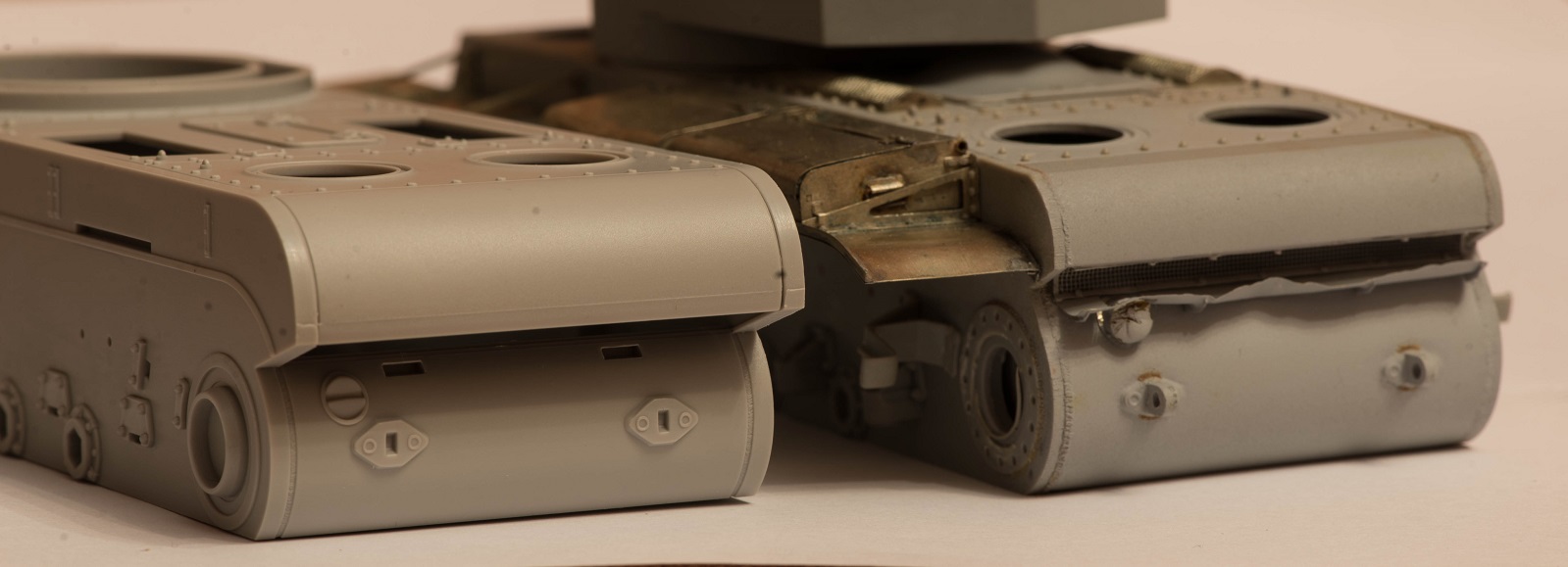 2) рымы для демонтажа крыши МТО отлиты заодно с ней. Эти же детали вполне хорошо были ранее сделаны на линейке обычных КВ. Непонятно зачем было здесь делать шаг назад...