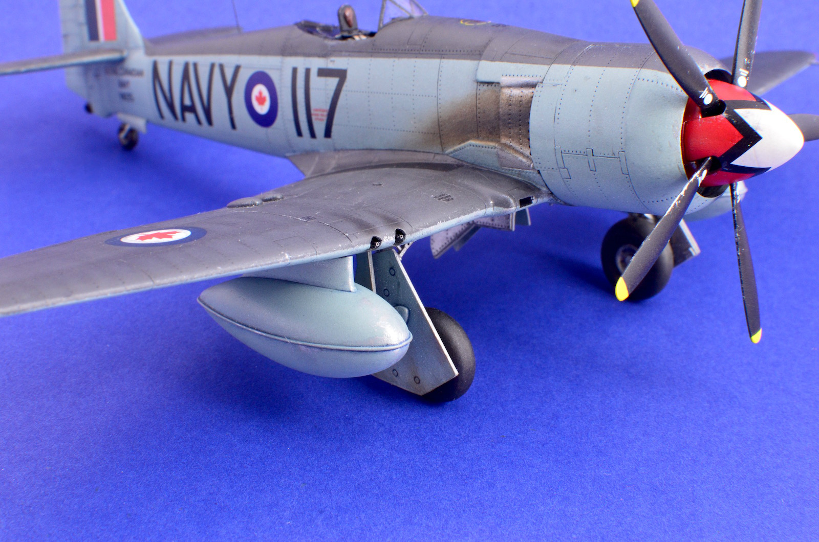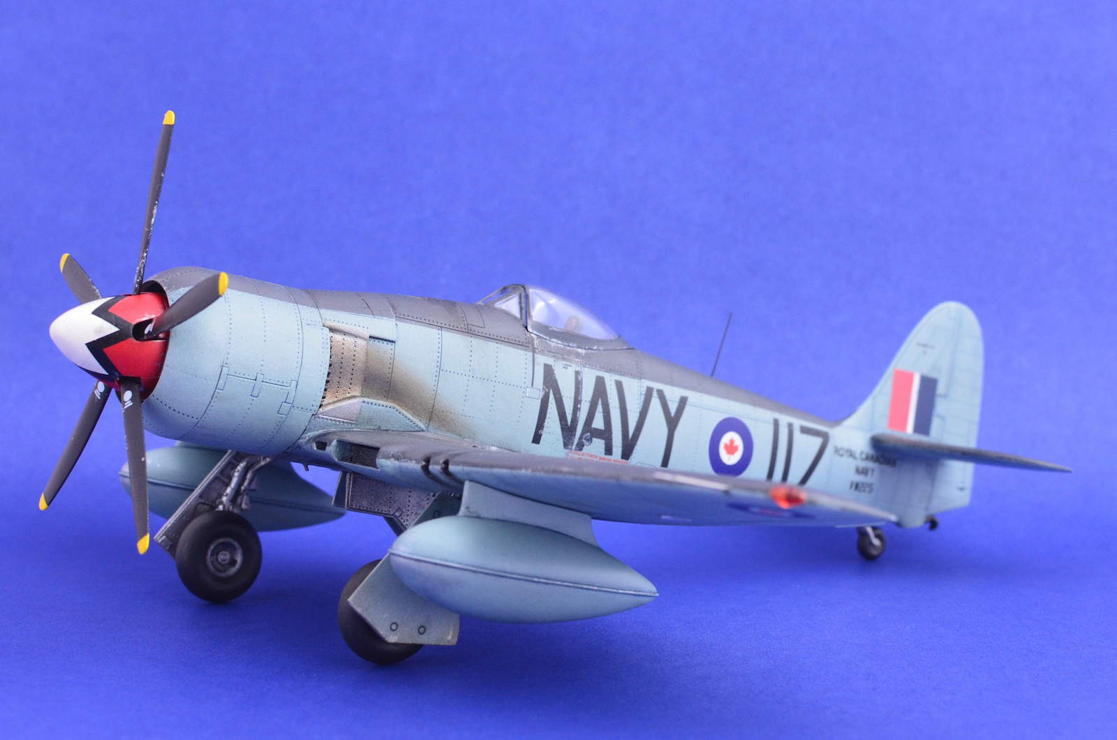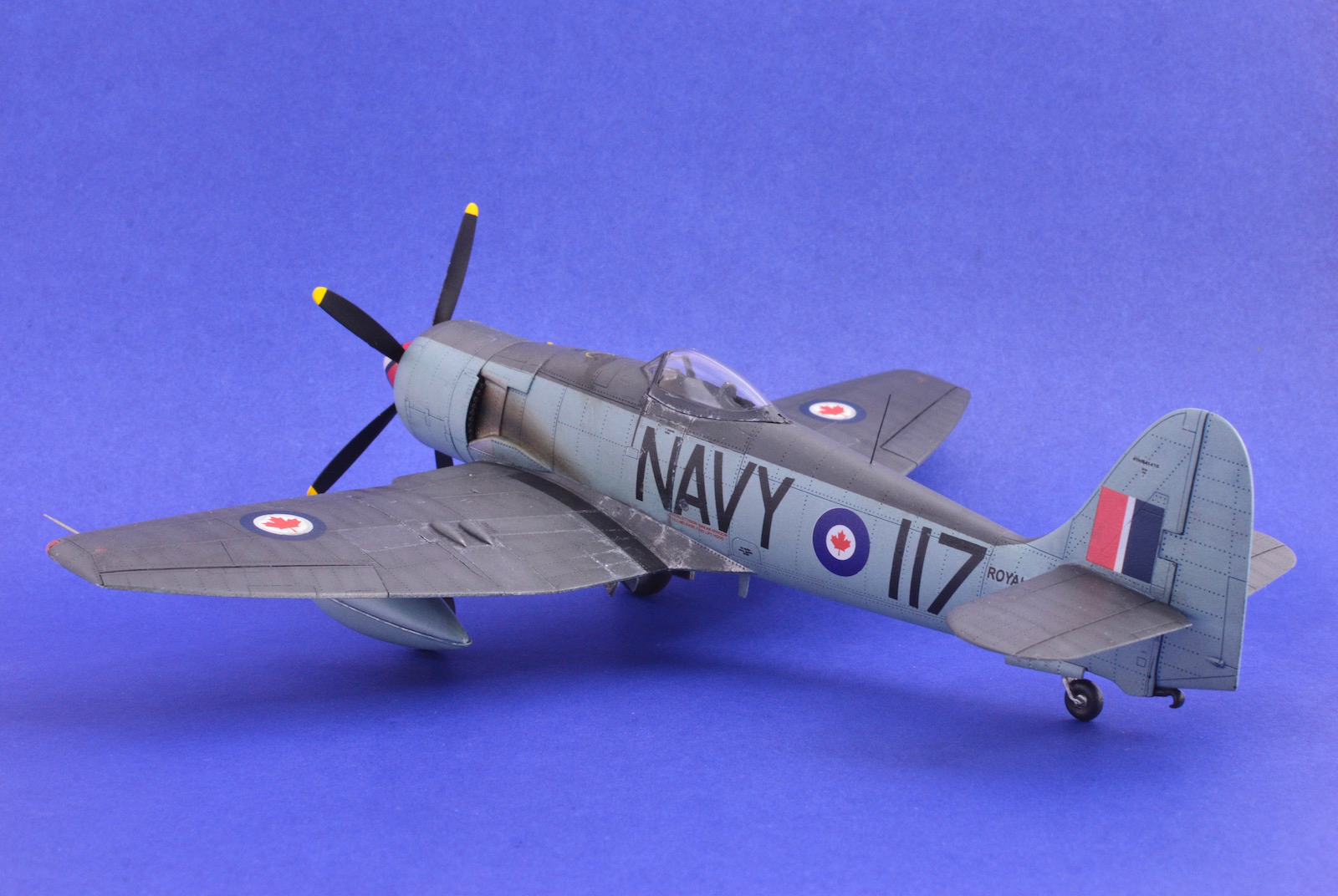 Уважаемые коллеги, представляю вам модель британского истребителя Hawker Sea Fury, краткую биографическую справку о нем можно получить здесь. Дальнейшее развитие линейки Hurricane - Typhoon - Tempest, Sea Fury не успел принять участие во Второй Мировой, но позднее наряду с поздними модификациями Spitfire составил основу британских ВМС и в составе сил ООН успел поучаствовать в Корейской войне. В целом машина получилась на редкость удачной, экспортировалась в ряд стран и оставалась на вооружении до 1956г, а после еще долго использовалась в качестве буксировщика мишеней и участника различных авиашоу.