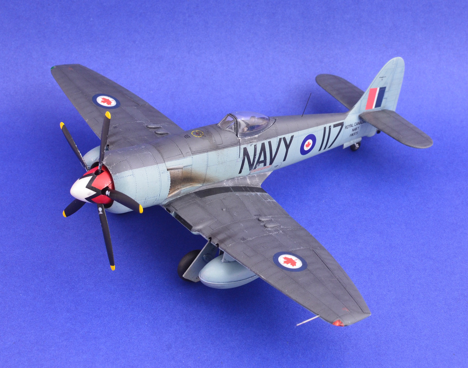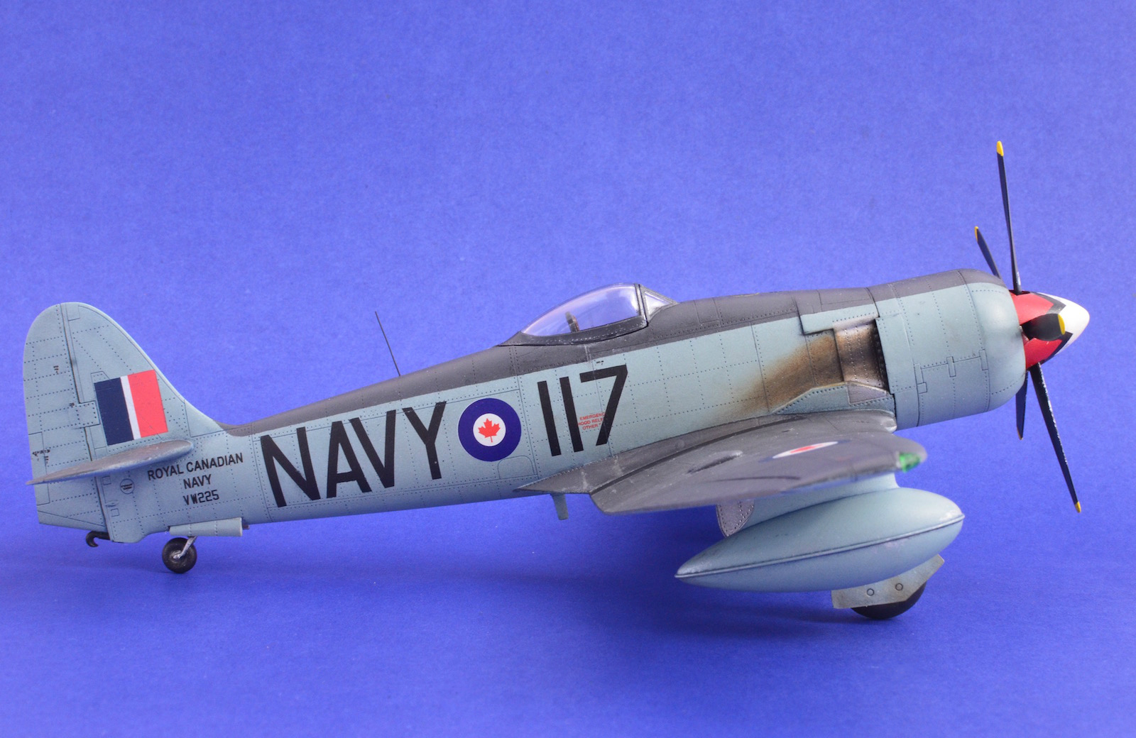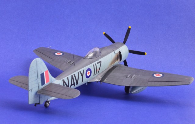 Уважаемые коллеги, представляю вам модель британского истребителя Hawker Sea Fury, краткую биографическую справку о нем можно получить здесь. Дальнейшее развитие линейки Hurricane - Typhoon - Tempest, Sea Fury не успел принять участие во Второй Мировой, но позднее наряду с поздними модификациями Spitfire составил основу британских ВМС и в составе сил ООН успел поучаствовать в Корейской войне. В целом машина получилась на редкость удачной, экспортировалась в ряд стран и оставалась на вооружении до 1956г, а после еще долго использовалась в качестве буксировщика мишеней и участника различных авиашоу.
