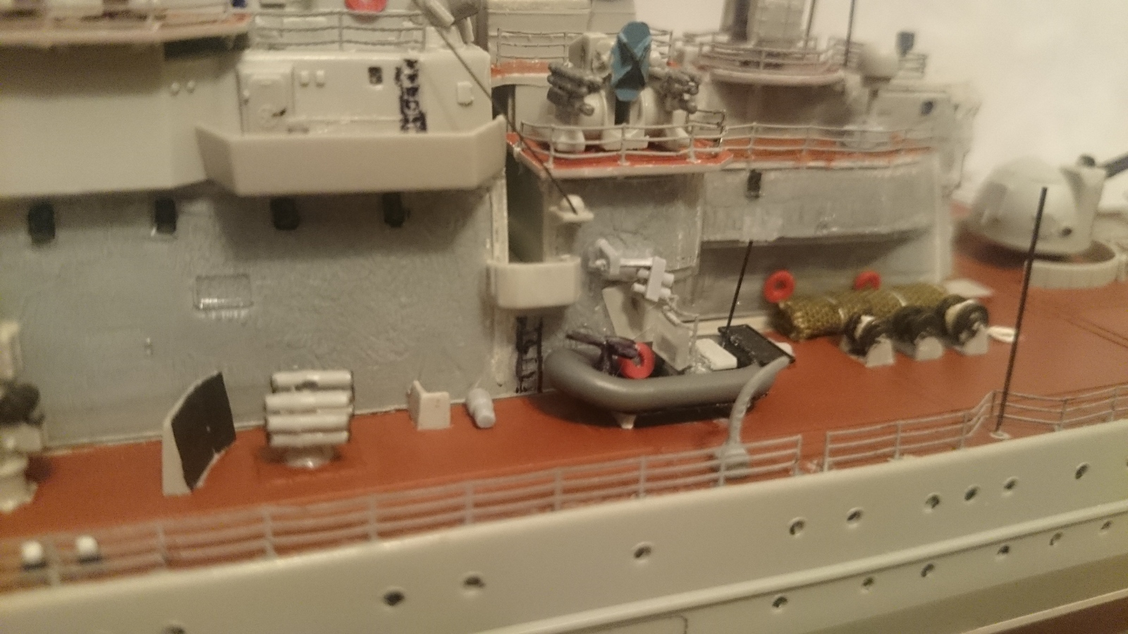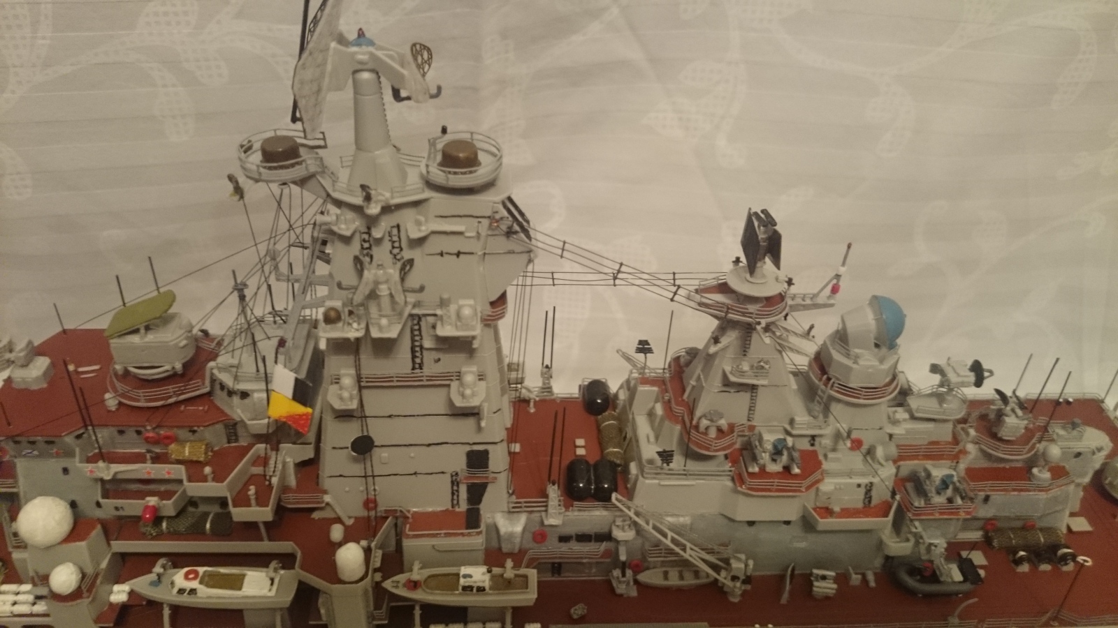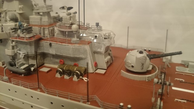 Вот мне модель нравится, но местами. С одной стороны раскрашенные шлюпки, маскироввочные сетки, с другой стороны отдельные части надстройки не покрашены совсем. Это видно на 2 -ой фотографии. Кормовой "Кинжал" похож на пластилиновую ворону из мультфильма. Кормовую арт установку , как Вы тоже обляпали. В общем "Песочница", хотя работа проделана огромная видимо поторопились, Александр.