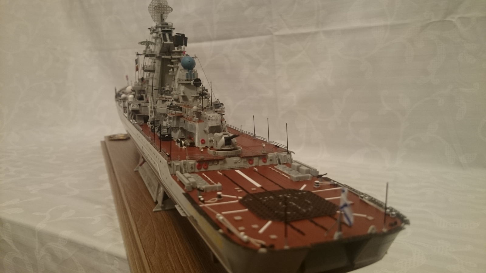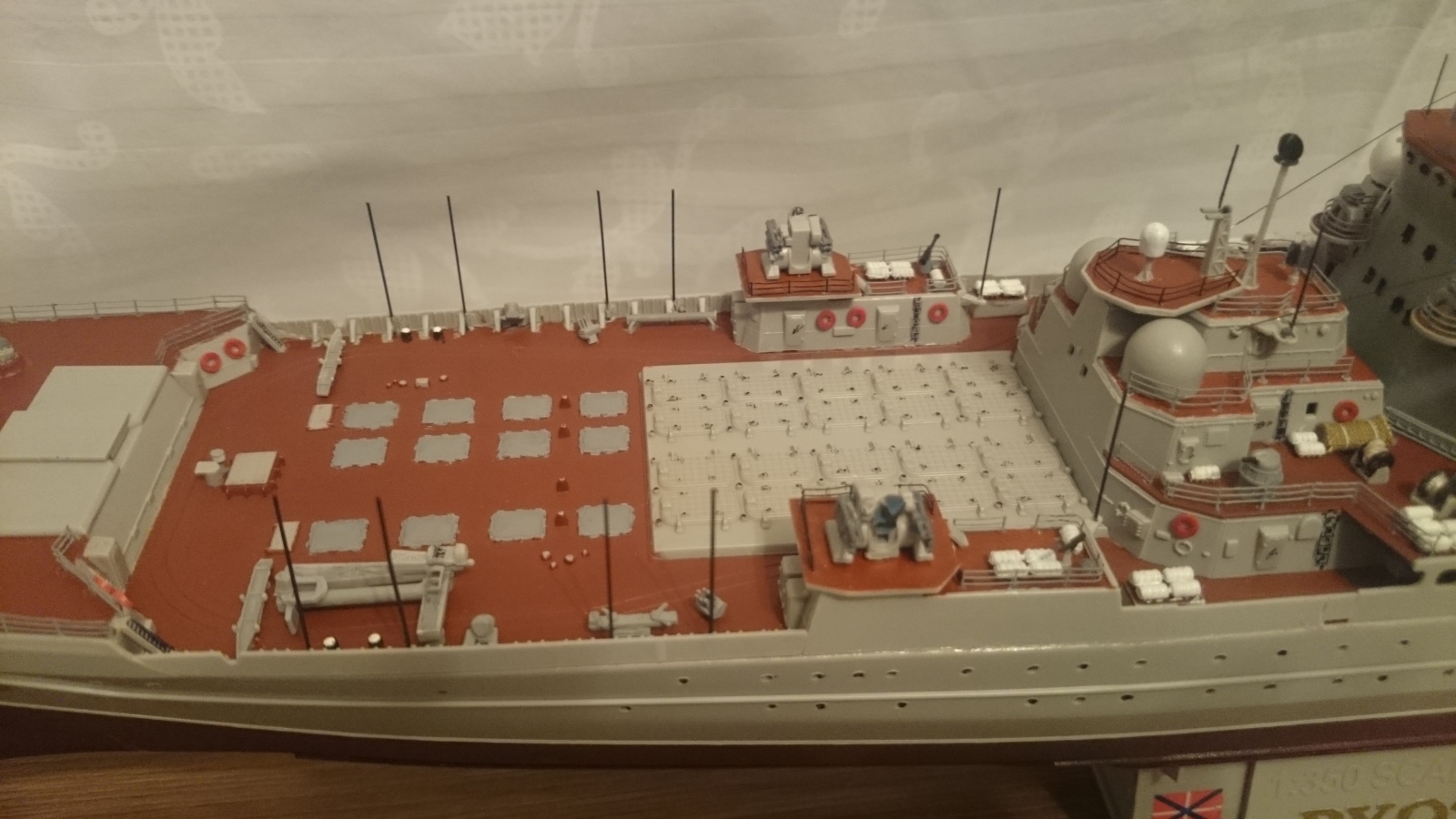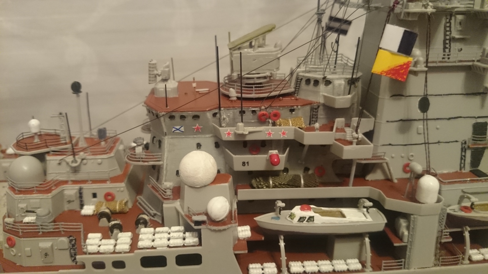 По недостаткам есть еще что прибавить к выше сказанному. Например попытка изобразить что-то вроде смывки, это как будто черным фломастером прошлись по швам))Кормовая надстройка(перед АК-130) не докрашена, не приклеена на палубу,висит в воздухе примерно на 30 см в пересчете в реал масштаб. Красно-желтый флажок крашен похоже тоже фломастером, очень неаккуратно. Швы в местах соединения пластика, где-то не шпаклеваны, где-то не очищены, тихий ужас...