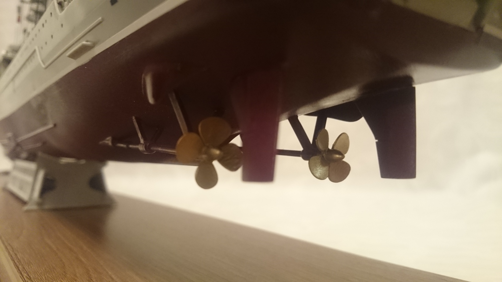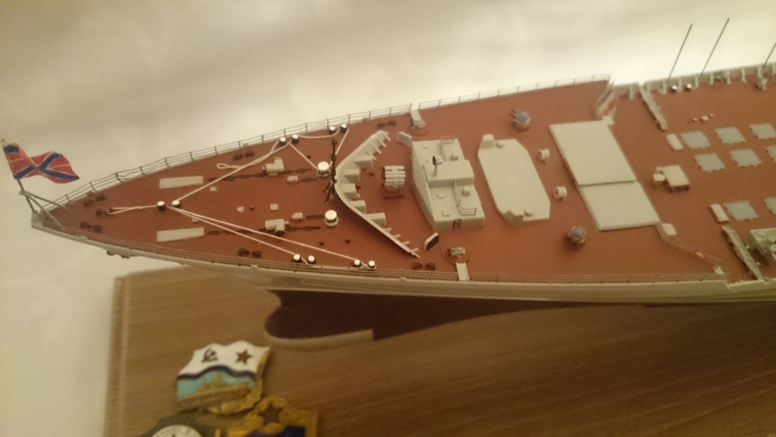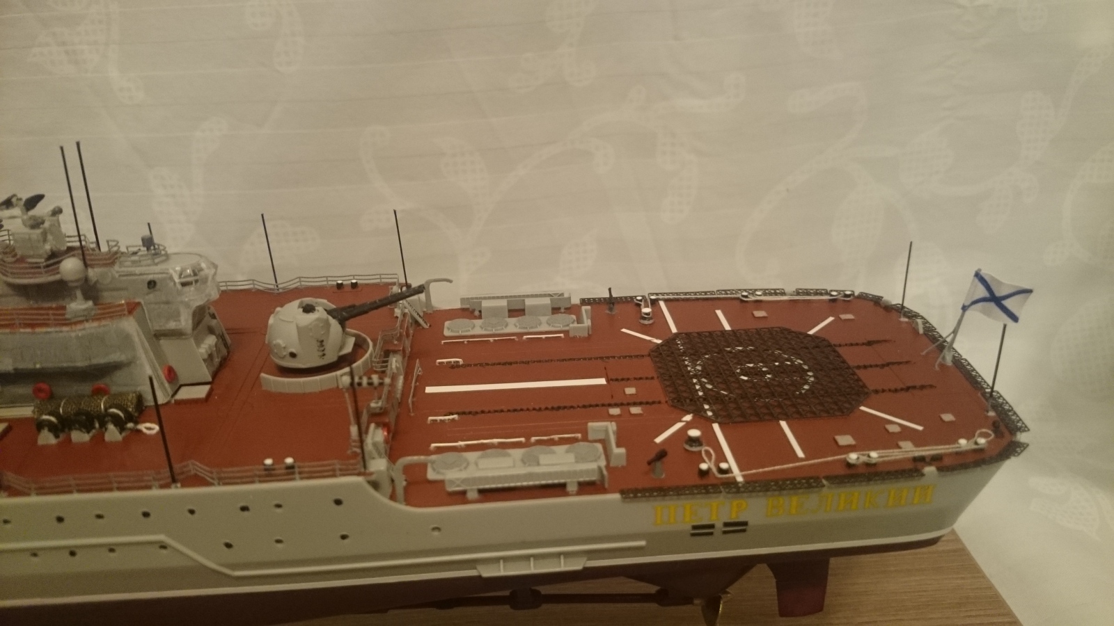 По недостаткам есть еще что прибавить к выше сказанному. Например попытка изобразить что-то вроде смывки, это как будто черным фломастером прошлись по швам))Кормовая надстройка(перед АК-130) не докрашена, не приклеена на палубу,висит в воздухе примерно на 30 см в пересчете в реал масштаб. Красно-желтый флажок крашен похоже тоже фломастером, очень неаккуратно. Швы в местах соединения пластика, где-то не шпаклеваны, где-то не очищены, тихий ужас...