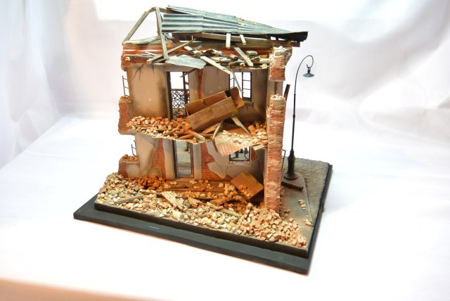 Здание очень хорошо получилось, а над фигурками стоит поработать. На тротуар, имхо, следовало бы ещё чего-нибудь накидать, ибо весьма странно получается: полуразрушенный дом, а рядом с ним почти никаких обломков.