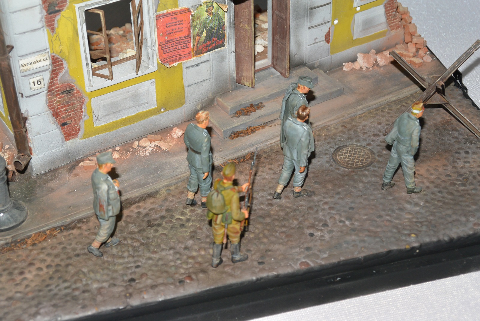 Плакатики, конечно, немножко не из этой оперы. На здании указатель улицы с польским названием, а плакат висит тот, который относится к рабочим Рейха - там написано "Работай так, как мы воюем". Этот плакат печатался до 1944 года и только в Германии. Второй плакат красного цвета - это листовка-объявление. Она не могла быть такого размера. Должна примерно соответствовать нынешнему А4. В-общем, как-то так. А в целом, работа приятная, смотрится нормально. Удачи.