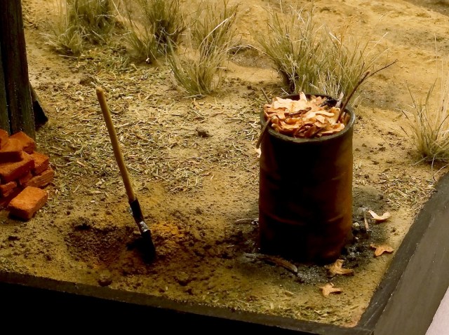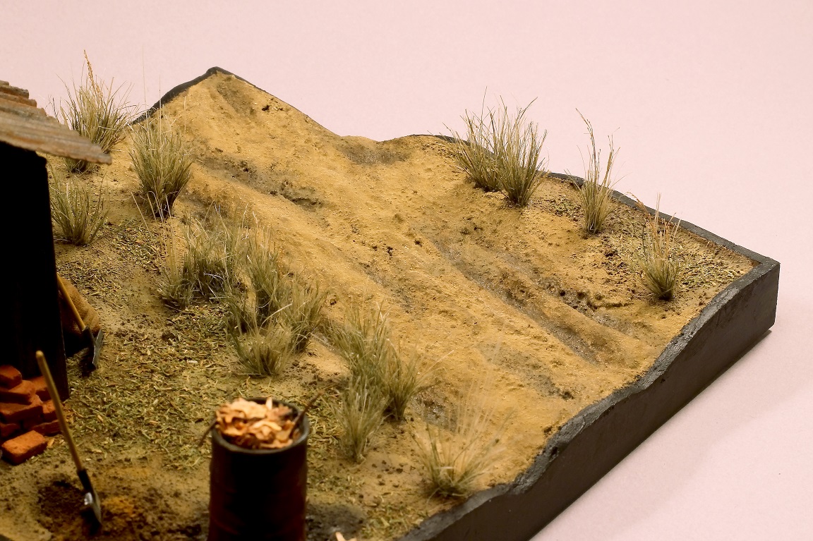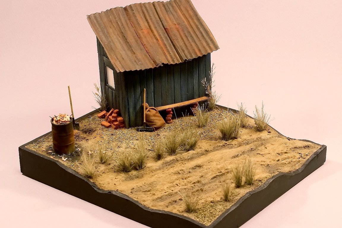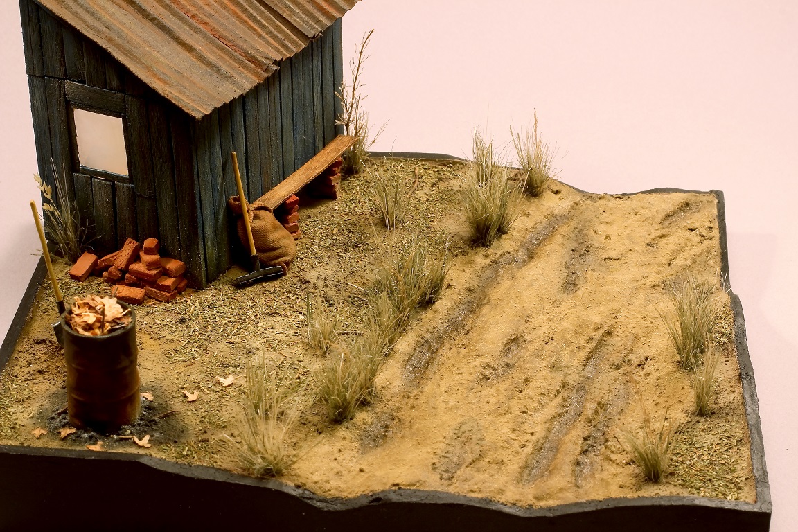 Всем доброго времени суток! Представляю свою очередную работу. Небольшая зарисовка осеннего денька загородной жизни. Диораму делал долго, с перерывами и паузами. Практически всё здесь самодельное, за исключением бочки – она из набора Тамии. По порядку: каркас сарая деревянная линейка, доски сарая из пвх пластика, кровля выполнена из гофра картона, основание диорамы XPS, поверхность земли, как и всегда модельная глина, текстура земли – песок разной фракции, растительность – окрашенный сушеный укроп и майоран (сухая приправа), сантехнический лён, а также различная высушенная растительность, рельеф дороги делал из гипса с песком подкрашенный масляными красками, кирпичи так же из модельной глины, мешок из пластыря, грабли и лопата из проволоки и пивжести. Красил эмалью от Тамии и ПВА темперой, пылил Мастер пигментом, так же использовал химию от AmmoMIG. Вроде ничего не забыл, как сие получилось – судить Вам. Всем приятного просмотра!