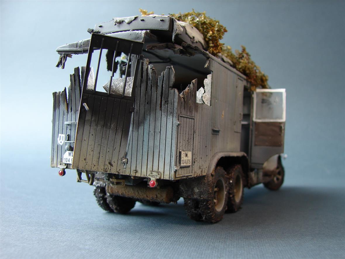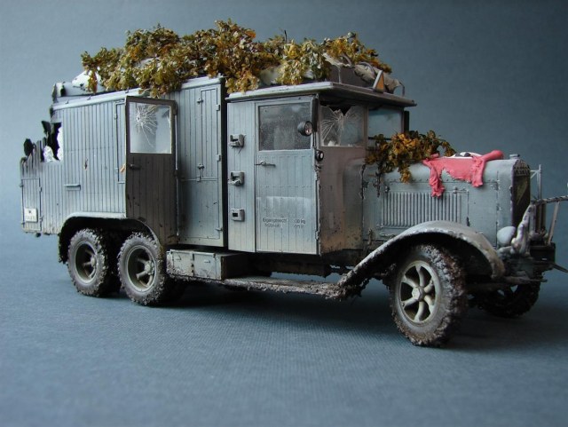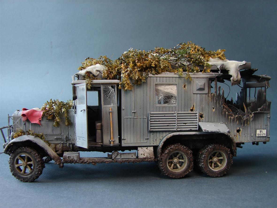 Работу и задумку оценил. Подкачала только логика имитируемых повреждений. Скорее, бесхозный фургон стоял полгода на обочине, проходящие мимо партизаны время от времени стреляли по окнам из табельного, выломали пару досок для костра, пробили на спор в нескольких местах прикладами дыры и в конце неудачно сварили борщ где-то внутри, вызвав случайно небольшой пожар, спаливший угол бытовки на колесах...