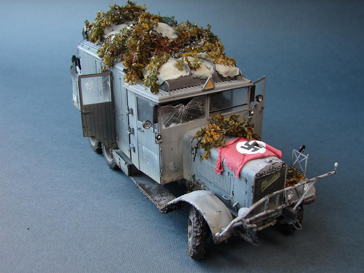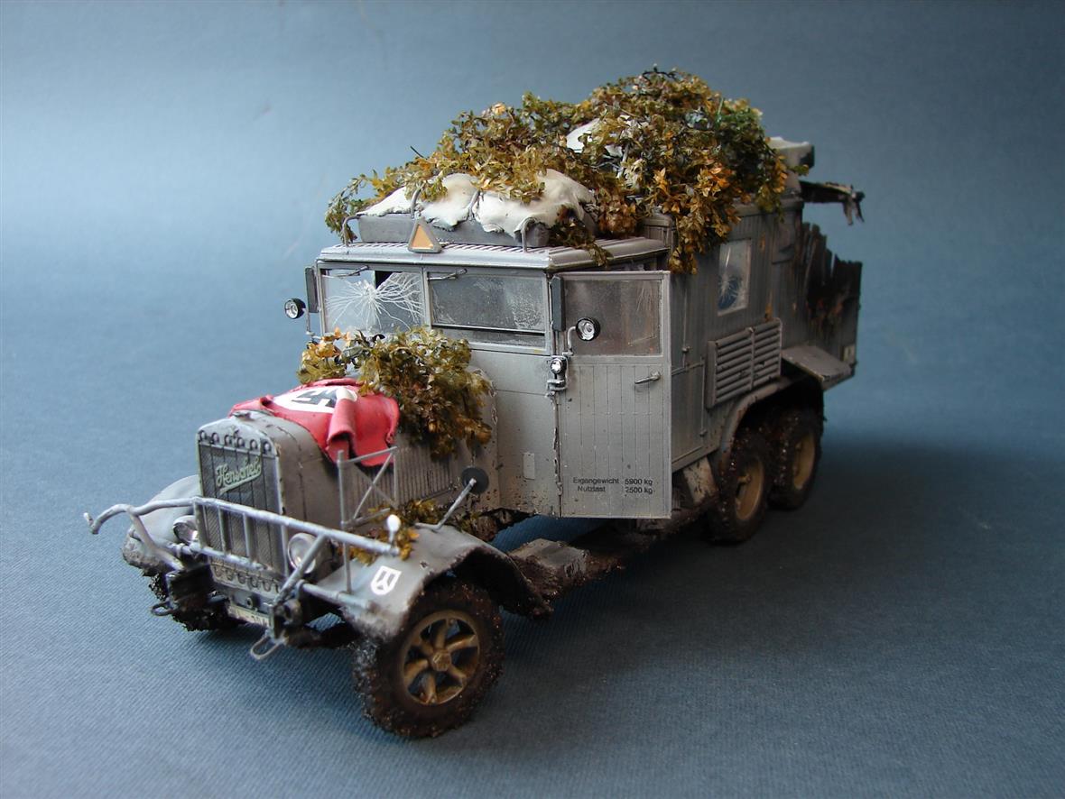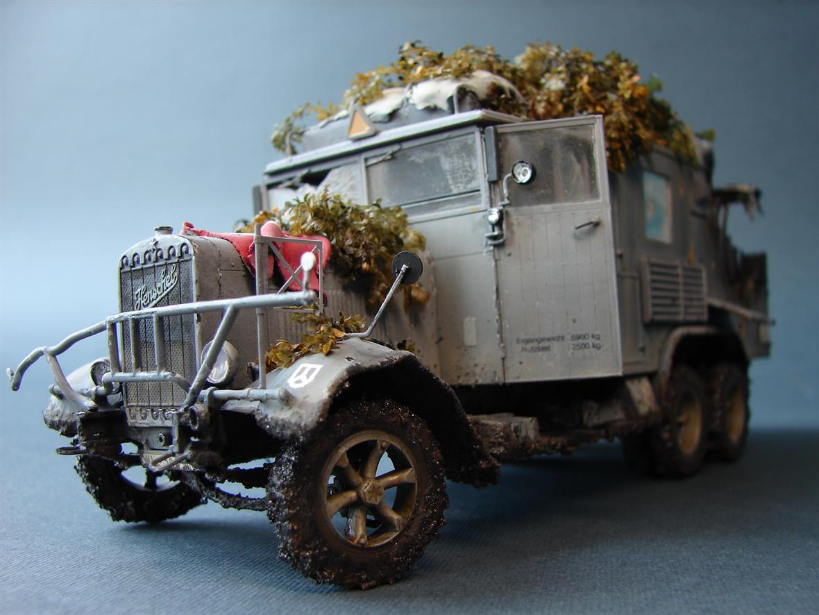 Модель сделана под диораму "Первая осень.Украина 1941"Немного разнообразил ,относительно неплохую модель,интерьером и следами разрушения.По-легенде: машина получила попадание навылет бронебойным.О самой модели,писалось не раз:сложная и хрупкая в сборке.Слишком ,не понятно зачем(?),наворочена ходовая.