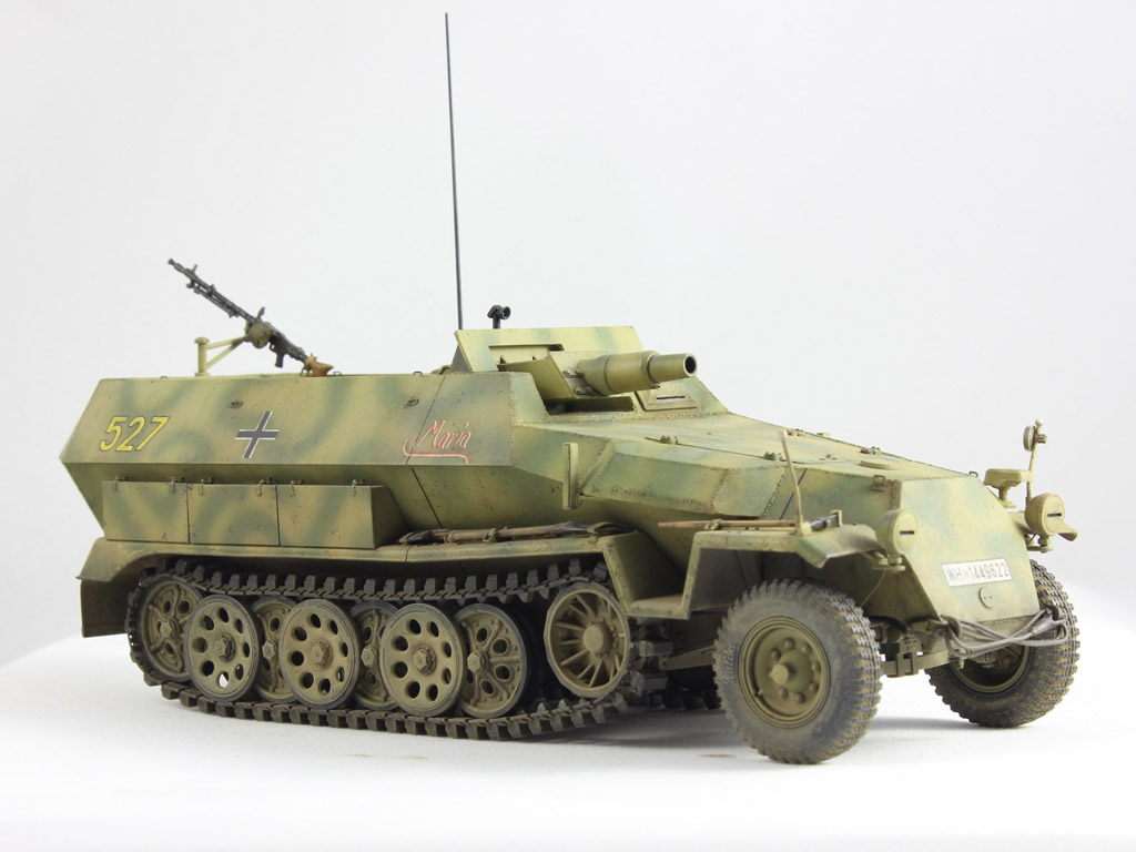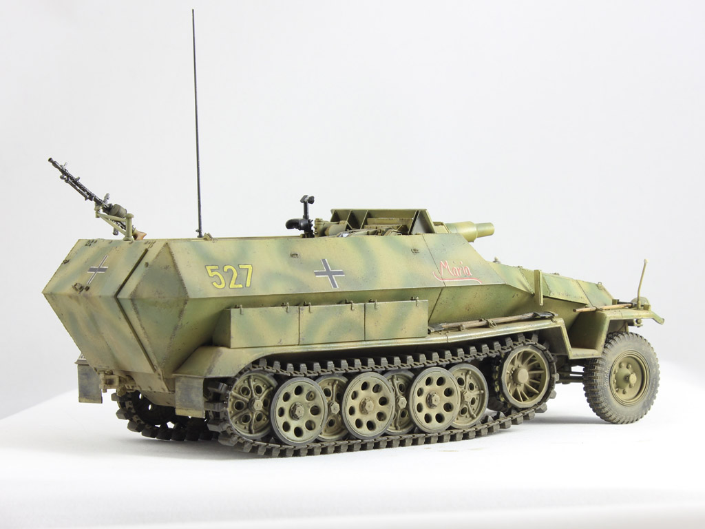 Всем доброго времени суток. Хочу представить Вашему вниманию модель полугусеничника Sd. Kfz. 251/9 Ausf. C "Stummel" от фирмы AFV Club. Образ у машины собирательный (найти прототип с надписью "Maria" не удалось). Сам набор вызвал двоякие чувства. Если "обвес" для "штуммеля" довольно свежий, то сам корпус разработан давно. Понравилось хорошо проработанное орудие, верная геометрия, понятная инструкция, гусеницы (хоть и резиновые). К минусам можно отнести скудное фототравление, плохая стыкуемость некоторых деталей (особенно "старых" с "новыми") и их немасштабная толщина (и это при так ювелирно отлитой пушке). Толщина декалей просто огромная (пришлось повозиться).