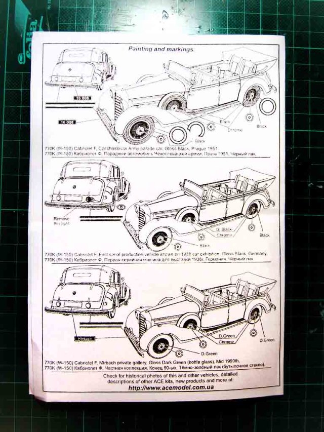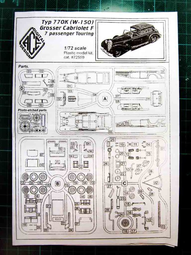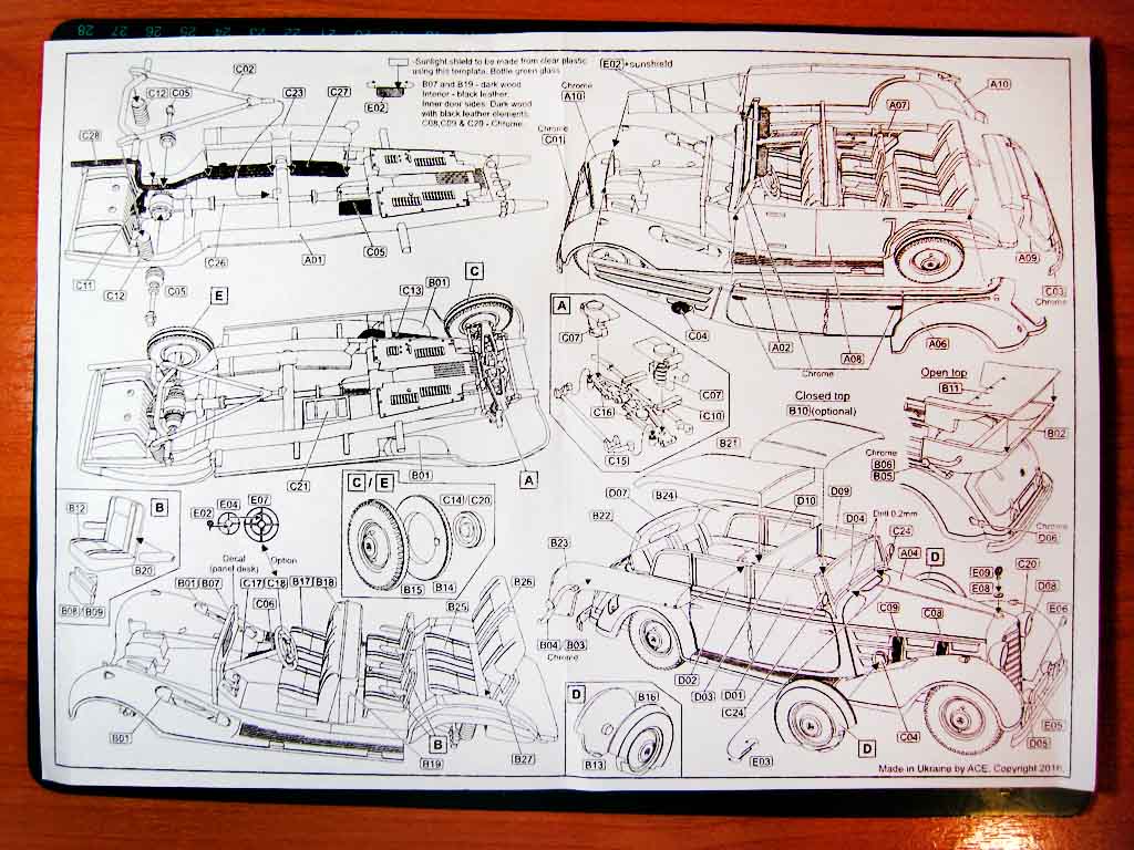 О модели. Сама модель отлита на удивление качественно. Сказывается видно новая матрица. Хоть и литьё низкого давления, но все мелочи проработаны и не замылены. Есть даже небольшая текстура кожи на сиденьях в салоне. Прозрачные детали имеют небольшие искажения, но они легко уберуться шлифовкой и футурой. Фототравление дополнит качество модели. Ну и даётся возможность собрать аппарат в трёх конфигурациях- со сложенным тентом, с закрытым тентом и с тентом только над пассажирским салоном.