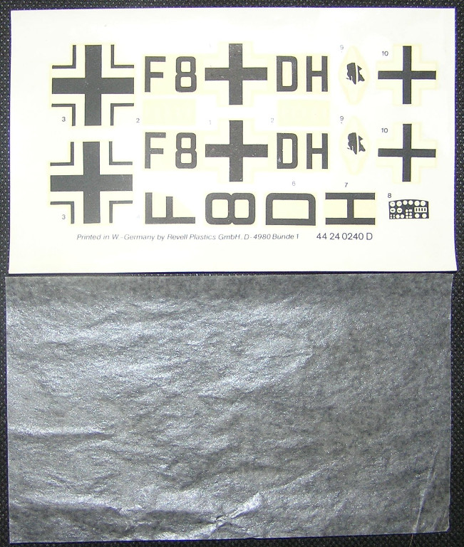 Набор также включает черно-белую инструкцию на листе формата А-5 и декаль на 1 вариант (F8+DH). Инструкция вполне информативна. Декаль примитивна по сегодняшним меркам, от времени пожелтела, при этом за долгие годы хранения сохранила все свои свойства: легко переводится, по качеству изготовления даст фору многим своим современным собратьям.