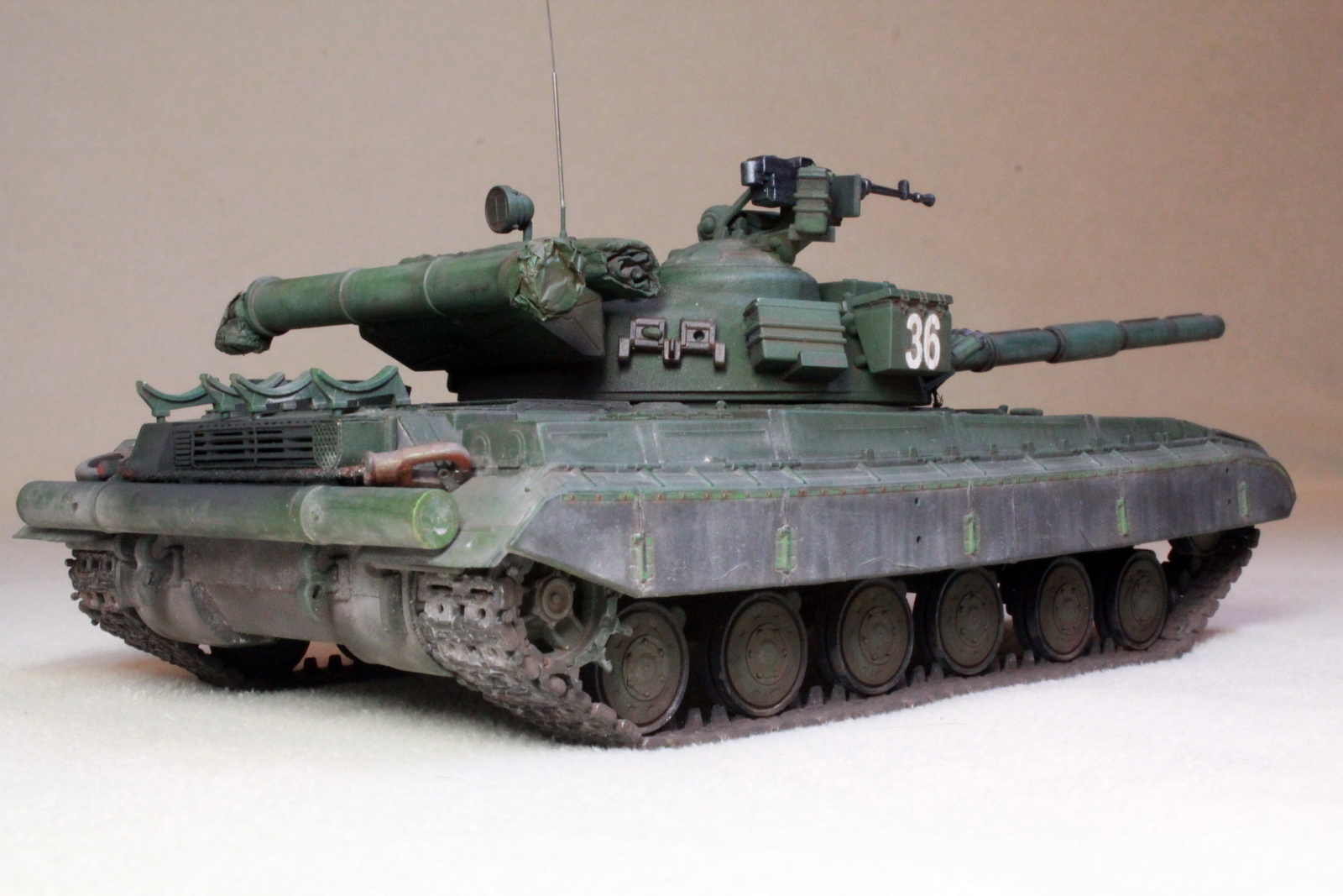 Окраска и тонировка, в целом, понравилась, но местами встречаются какие-то волосины. Не должно быть копоти на входных сетках МТО. И на фоне не сильно ушатанного танке абсолютно ржавые тросы выглядят очень странно. А вот с декалями печаль: Номера серебрятся, под знак гвардии на прожекторе, похоже, забрался пузырек воздуха, края серебрятся. Да и следовало бы его пролить смывкой, чтобы на нем проступил рельеф крышки прожектора.