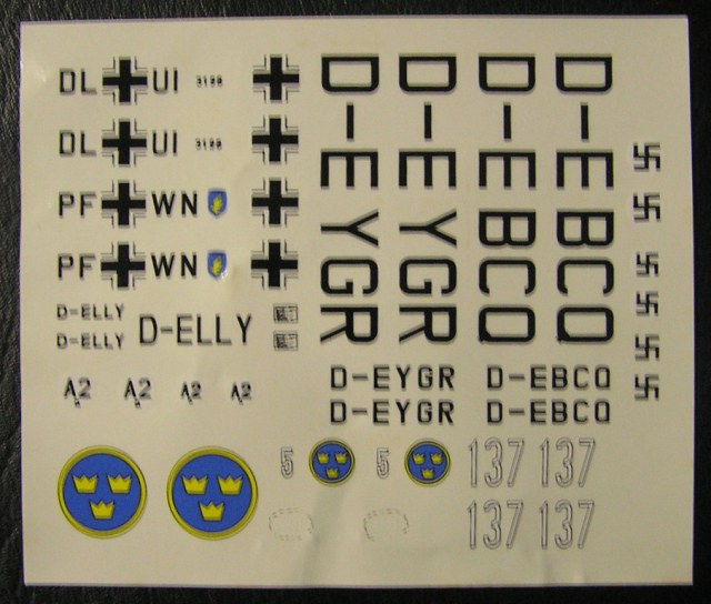 В набор входит вполне информативная черно-белая инструкция на листе формата А-3 в которой: историческая справка, ТТХ, 6 вариантов окраски (в том числе швед и современный немец), схема сборки и чертеж в масштабе 1:72. Декаль на теже 6 вариантов окраски. Качество декали отличное (время её не убило), только уж больно она глянцевая и этот глянец на серебристых поверхностях мне победить не удалось.