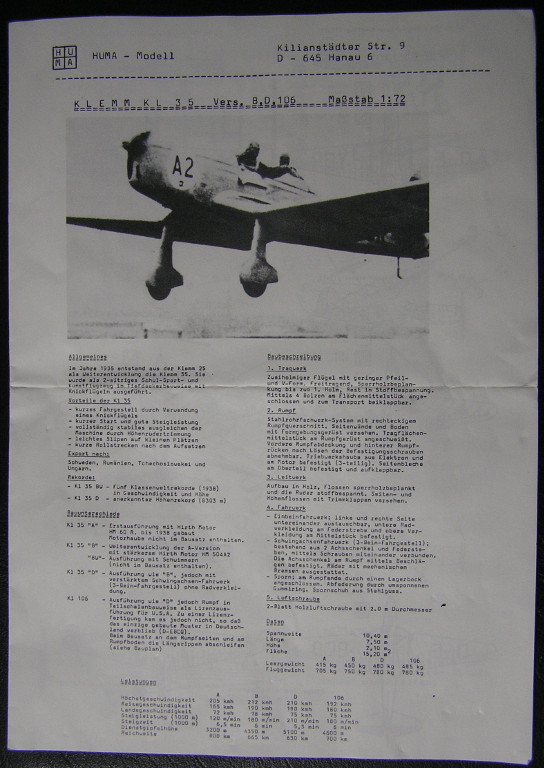 Klemm KL.35 vers.: B, D, 106 - ЛНД от HUMA-Modell в масштабе 1/72