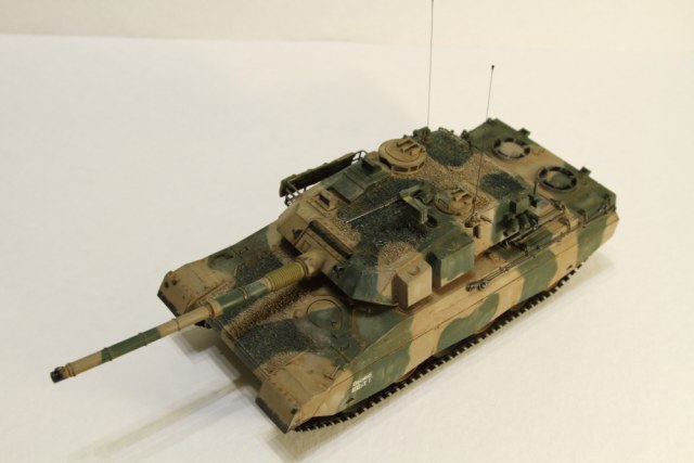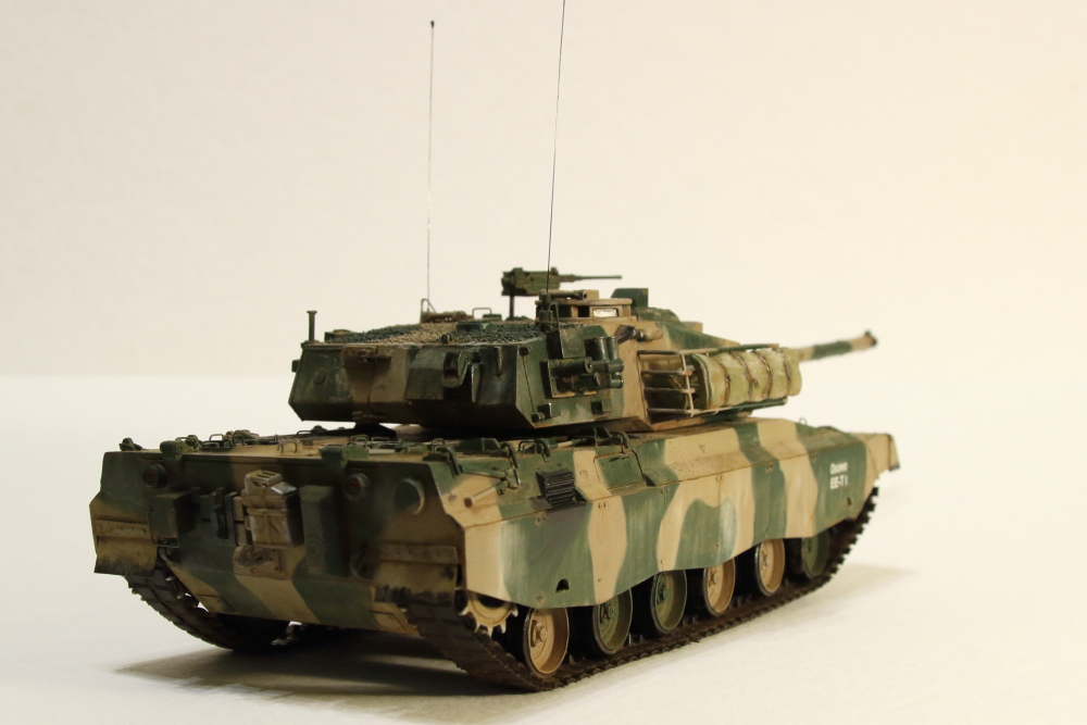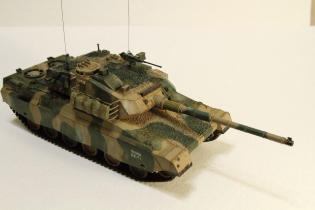 Лично я считаю, что этот танк по фактуре довольно скучен, как и абрамс, и художественно представить его модель довольно непросто. Ваши доработки мне понравились, без них модель была бы невзрачна. Не понравился антислип, смотрится как бразилец в шубе. Работа с запылением не понятна, оптики нет, резиновые крышки на дымовых мортирках глянцевые.