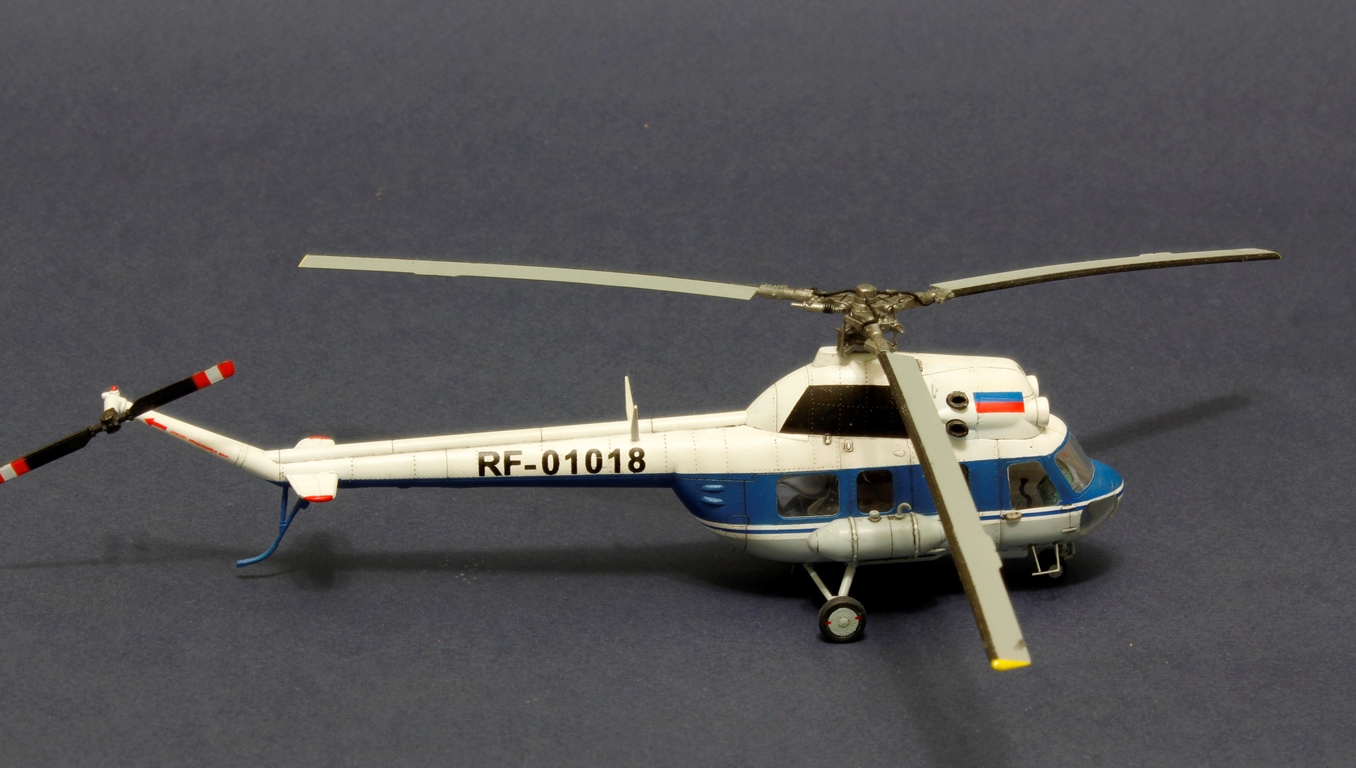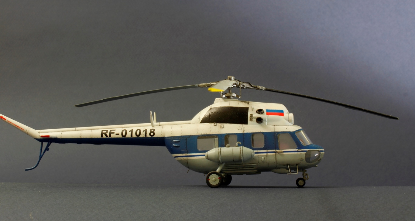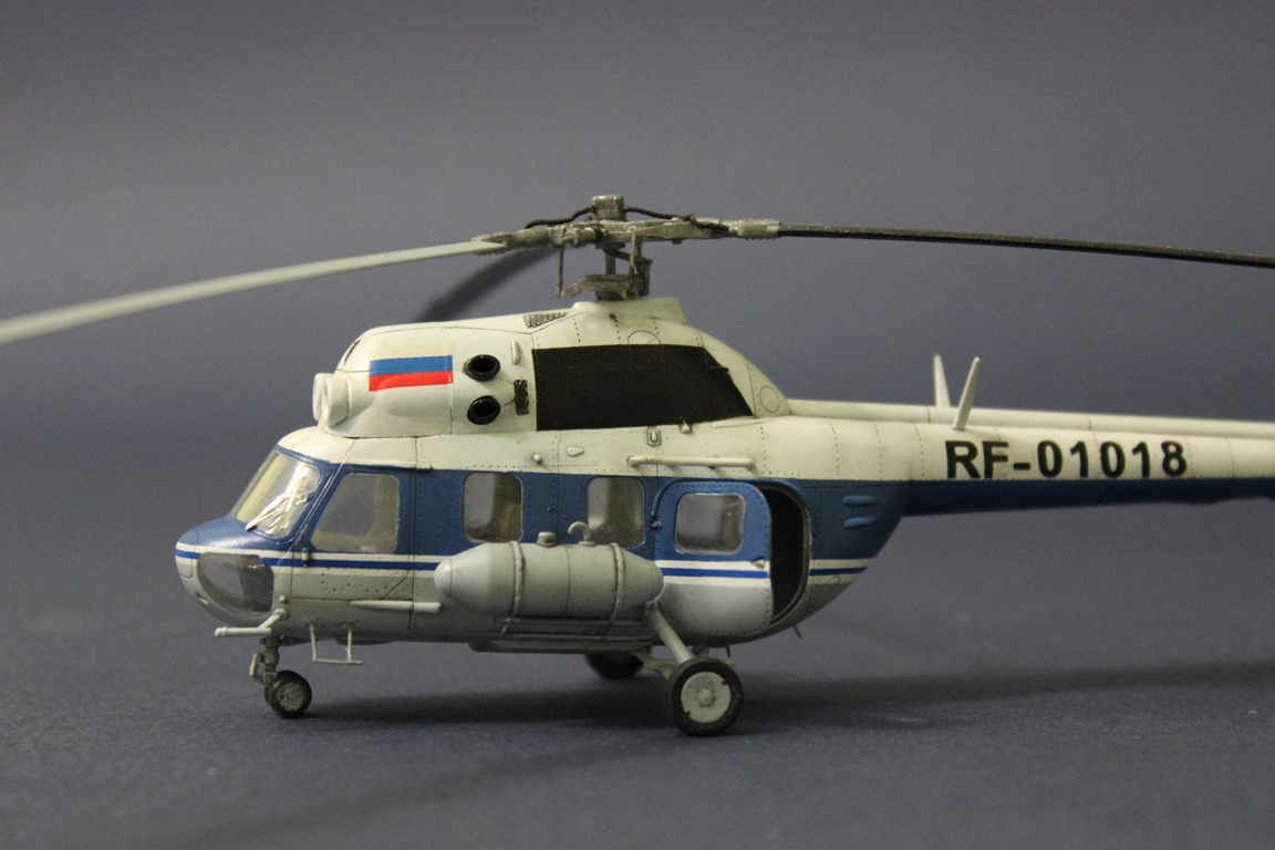 Здравствуйте! Давненько ничего не выкладывал, хотя модель была сделана давно, ещё летом, времени всё не было отснять! Прототипом был выбран реальный борт RF-01018. Сборка проблем не вызвала, всё стыкуется отлично, минимум шпаклёвки - по швам. Геометрия порадовала намного больше чем у Ми-4 этого же производителя, хотя втулку пришлось полностью переделать чтобы на реальность стало похоже. Так же от себя добавил немногочисленные антенки, самостоятельно сделал подножки - родные из набора даже близко не похожи на реальные. Сильно до мелочей в матчасть не вдавался, так что сильно за это не ругайте. После сборки и покраски уже нижняя выхлопная труба по левому борту запала внутрь, так и не смог вынуть) Полосы красил сам, номер на балке и флаги на капотах - из разных наборов декалей собирал. Красил как обычно тамией, смывкой оживил расшивку. Пачкать не стал, на фото прототип весьма ухоженный, да и не большой я любитель копоти и грязи)