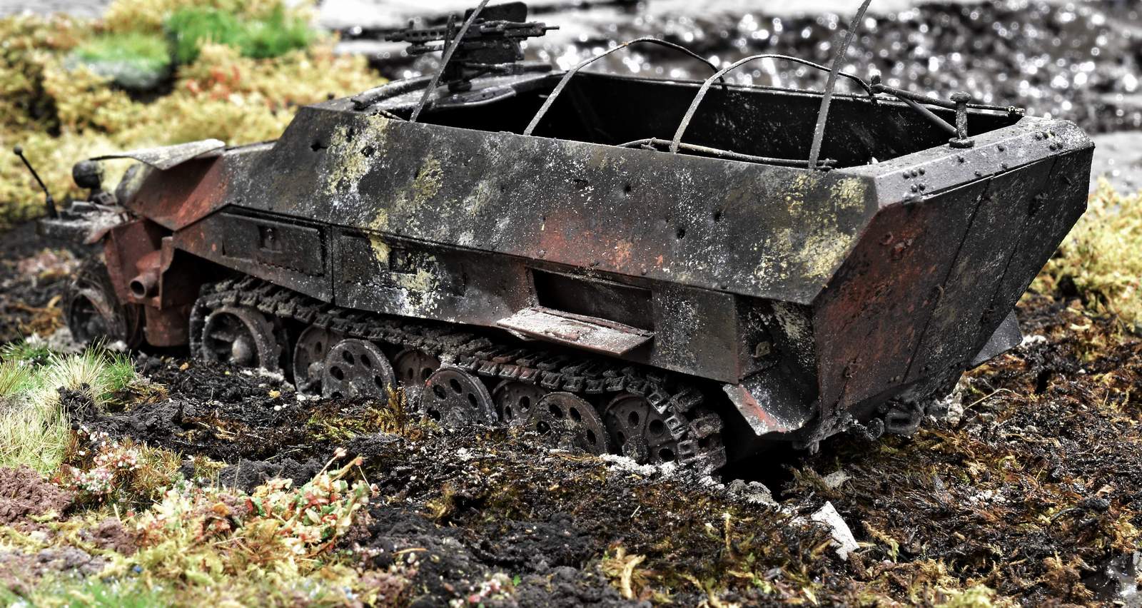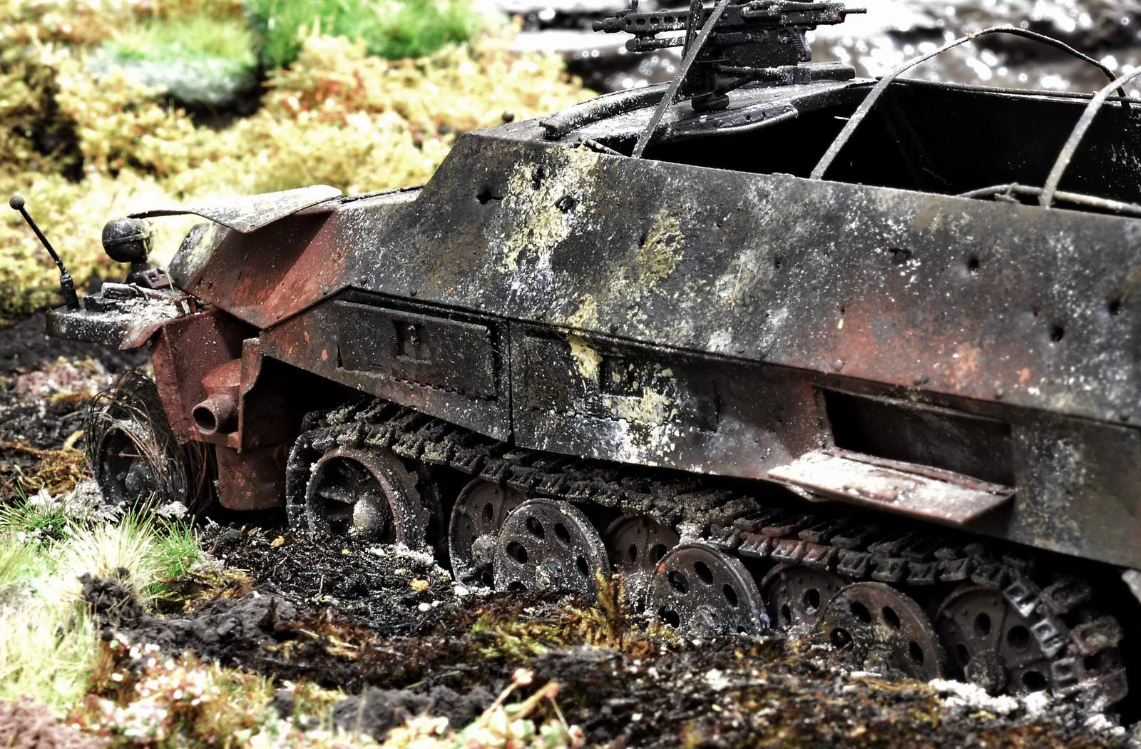 Представляю модель немецкого бронетранспортёра в таком необычном виде или состоянии. Очень хороший набор, но купить очень сложно и дорого. Корпус вырезан из листовой латуни. Каждый каток модели сточен, у каждого трака срезана и высверлена резиновая подушка.
