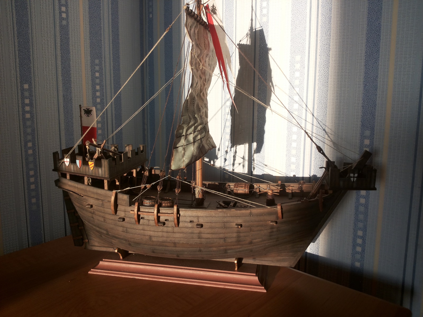 Модель сделана неплохо, но парус, висящий как простыня, портит весь вид...( Лучше было или надуть его, или показать убранным.. ИМХО. Ну, и правила есть правила - должна быть описательная часть работы над моделью. А вот фон в виде обоев или монитора компьютера не должно быть.