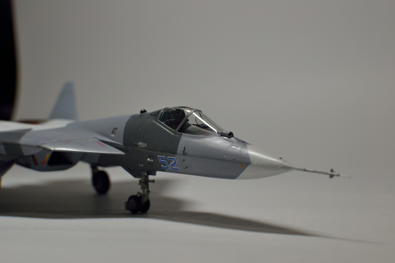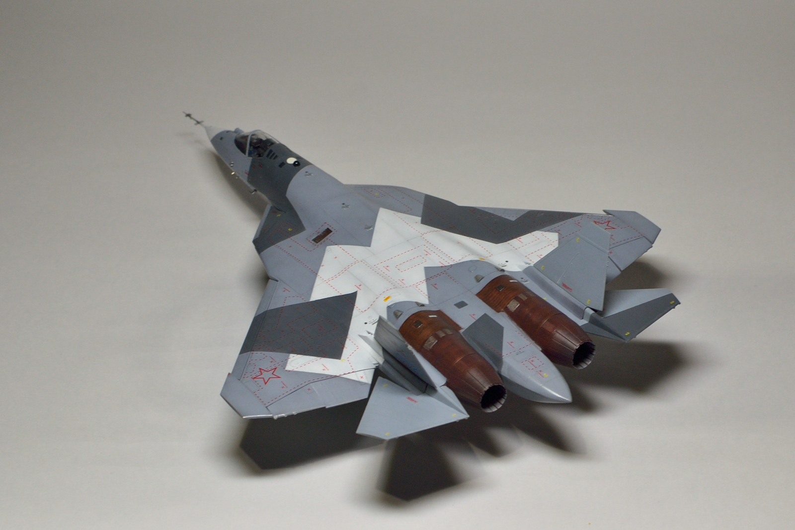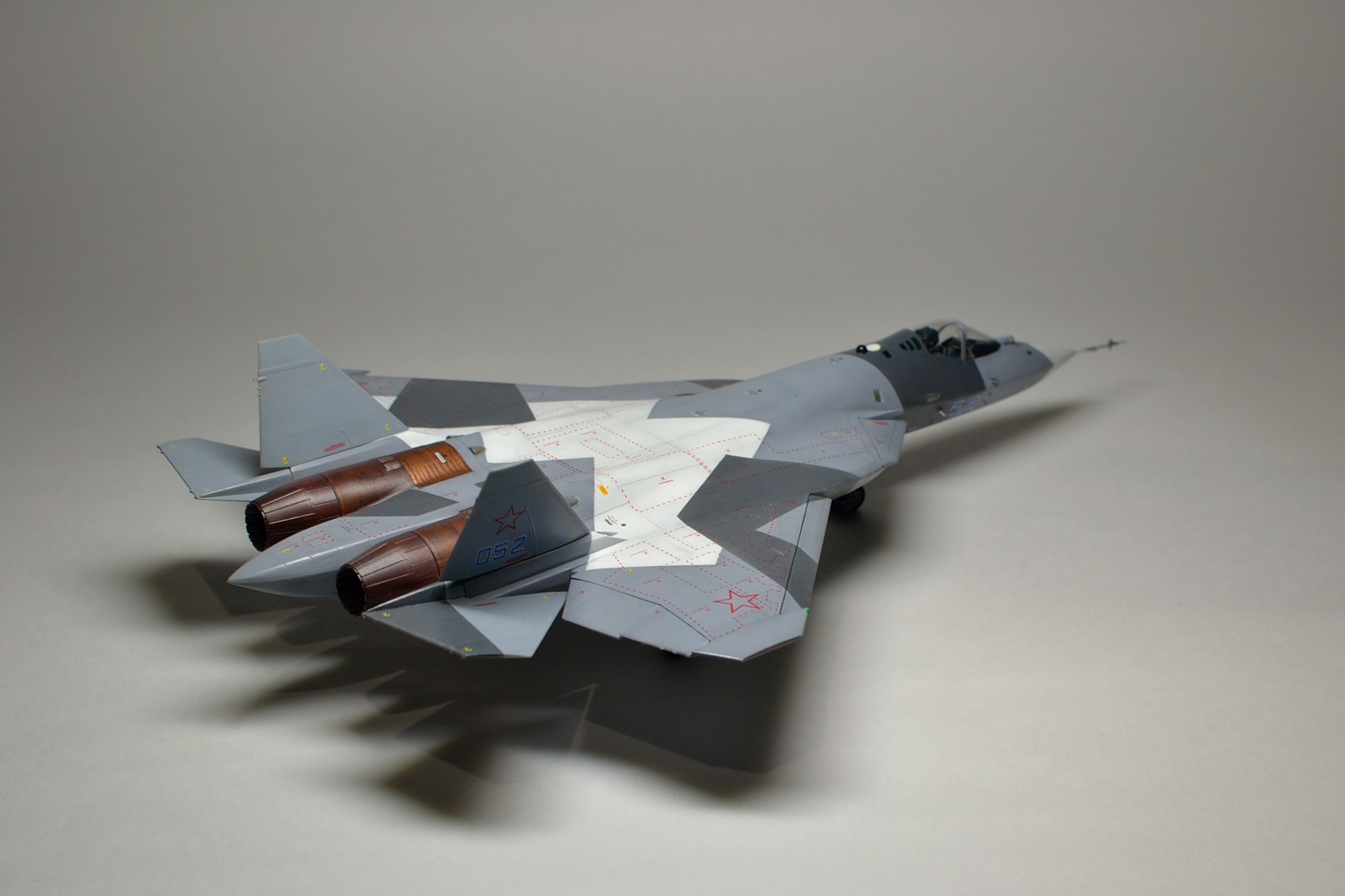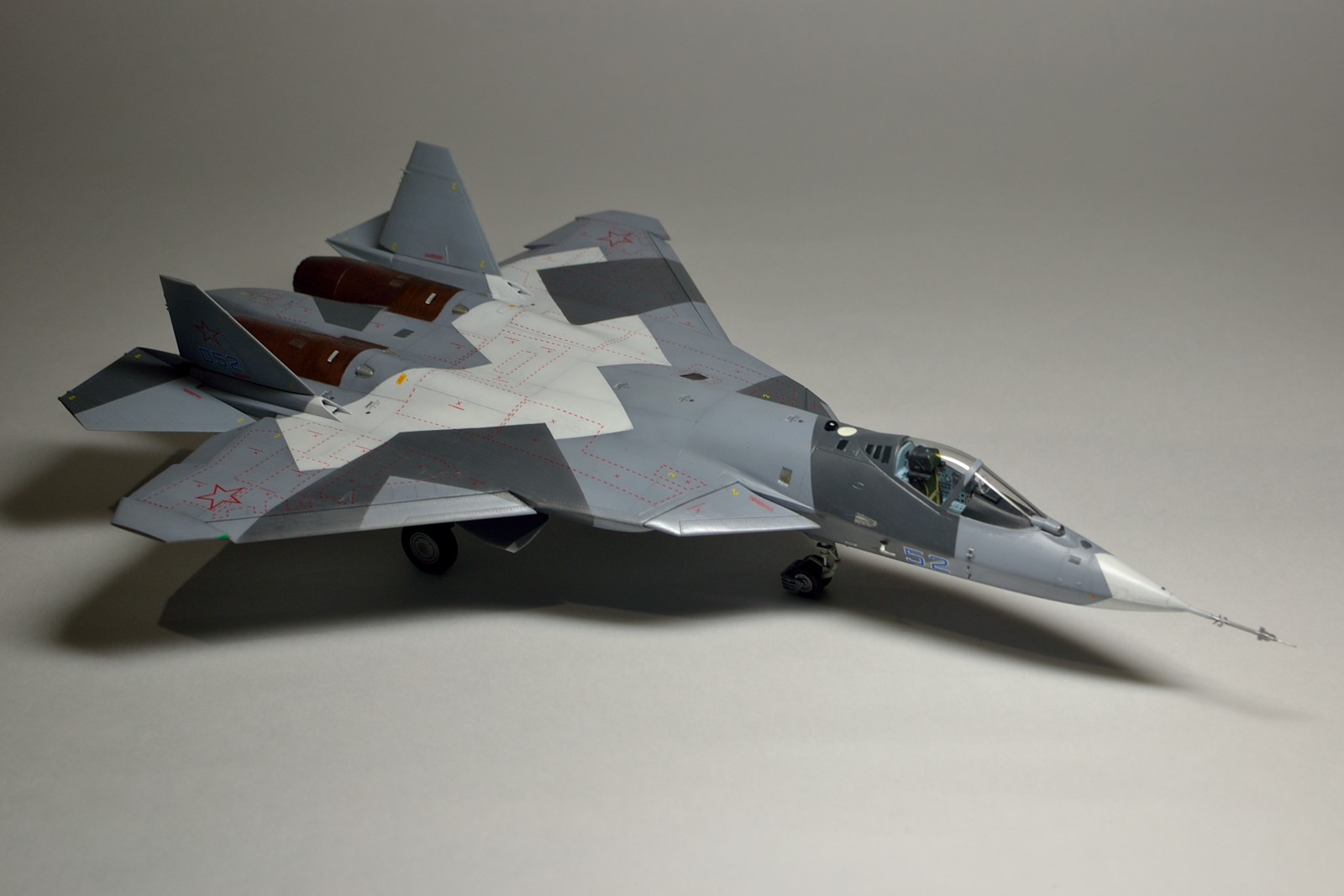 Приветствую всех! Рад представить вам свою очередную работу, перспективный самолет с индексом Т-50. Собирал и красил в перерыве от сборки другой модели, поэтому доработок минимум, вырезал закрылки, и так по мелочи. Набор от арк моделс мне в целом понравился, хорошая стыкуемость, приятный в работе пластик хобби босс, прозрачный фонарь, аккуратная расшивка, подробная декаль от бегемот. Есть косяки в геометрии, пластик предполагает скорее 053 борт, нежели 52. Исправлять почти ничего не стал. Красилось эмалями тамия, легкий прешейдинг, смывка- акварель, лак акриловый тамия- глянец/ полуматовый. Полуматовый дал местами небольшую белёсость, не первый раз такое. Цвета мешал на глаз. Приятного просмотра!