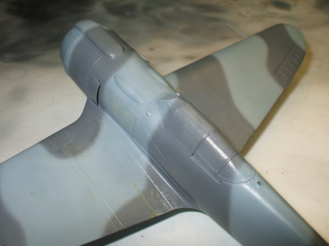 По покраске, все как всегда: Supermetallicот Mr. ColorSM 01 , тамиевским скотчем прикрыты жаропрочные панели и стяжные ленты капота, футура, лак для волос, прешейдинг, камуфляж намешан из акрила от TAMIYA, мытьё жесткой кистью под проточной водой для имитации сколов по металлу, кисточкой нанесены сколы ЛКП на плоскостях, футура, декали(штатные), смывка, матовый лак от HobbyColor, масляные точки, смывка выборочно, финишное покрытие матовым лаком.