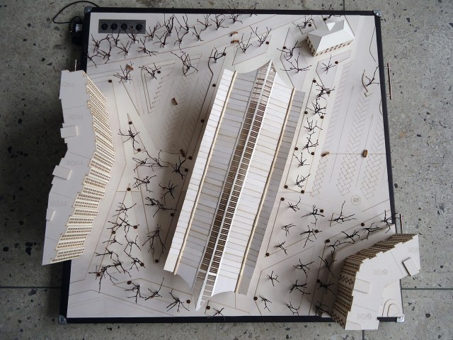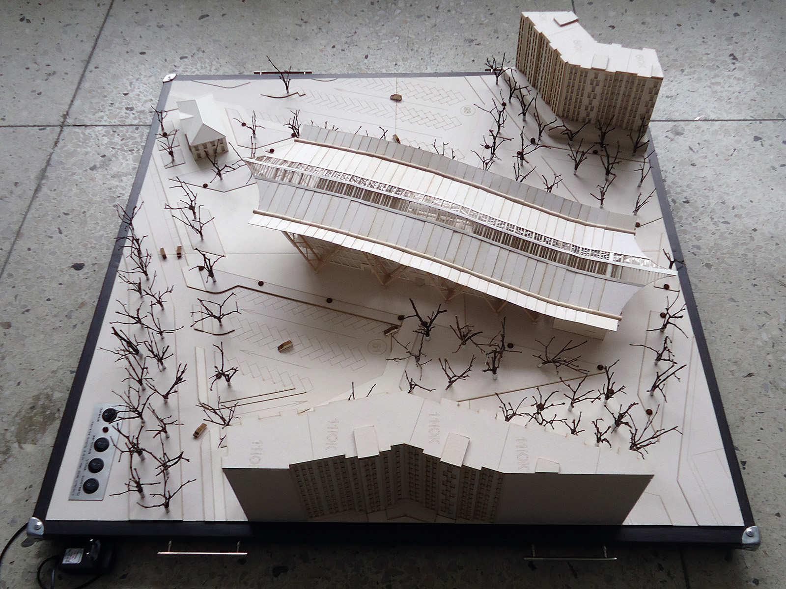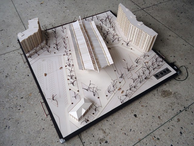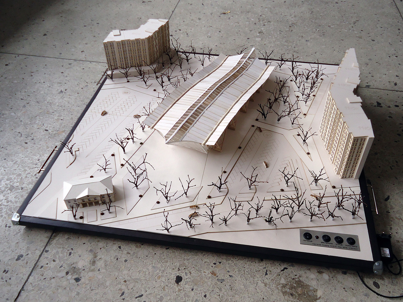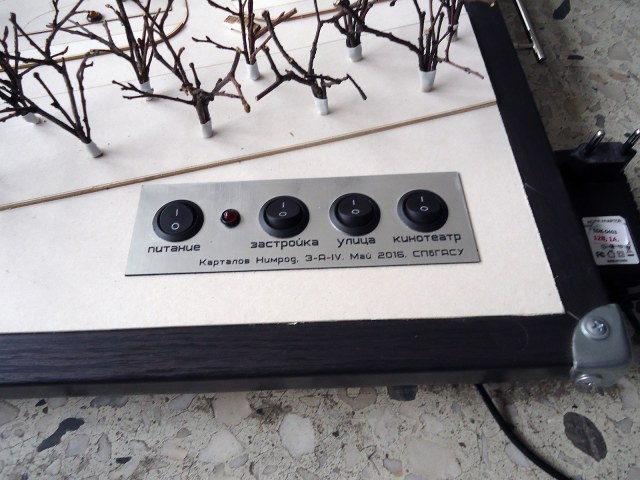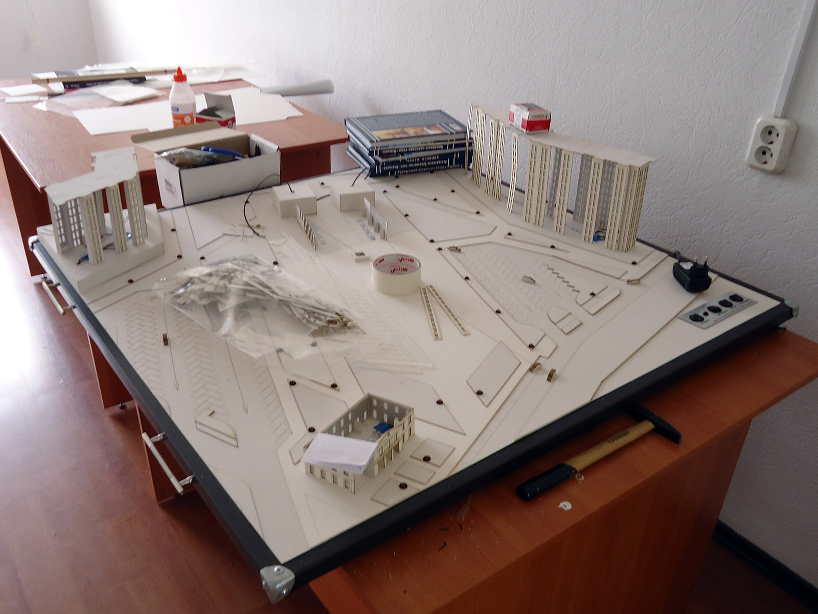 Макет учебного проекта 4 курса. Масштаб 1:200. Строился с апреля по октябрь 2016 года с перерывами. Материал - пивной картон 0,9 мм, много лазерной резки, настоящие ветки деревьев, оргстекло, пленка от файлов, цветная бумага для рисования, калька, термоусадочная трубка, много проводов и светодиодов).