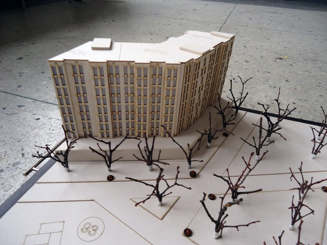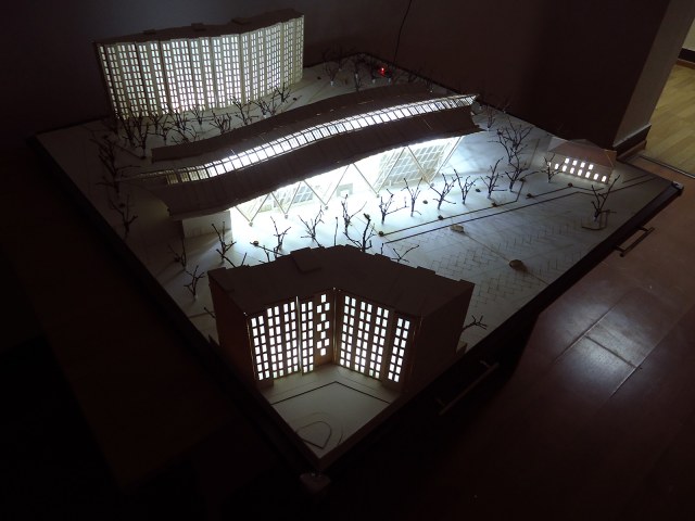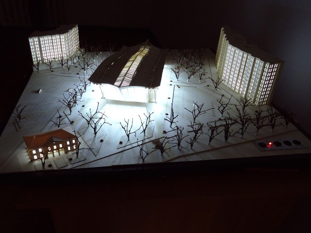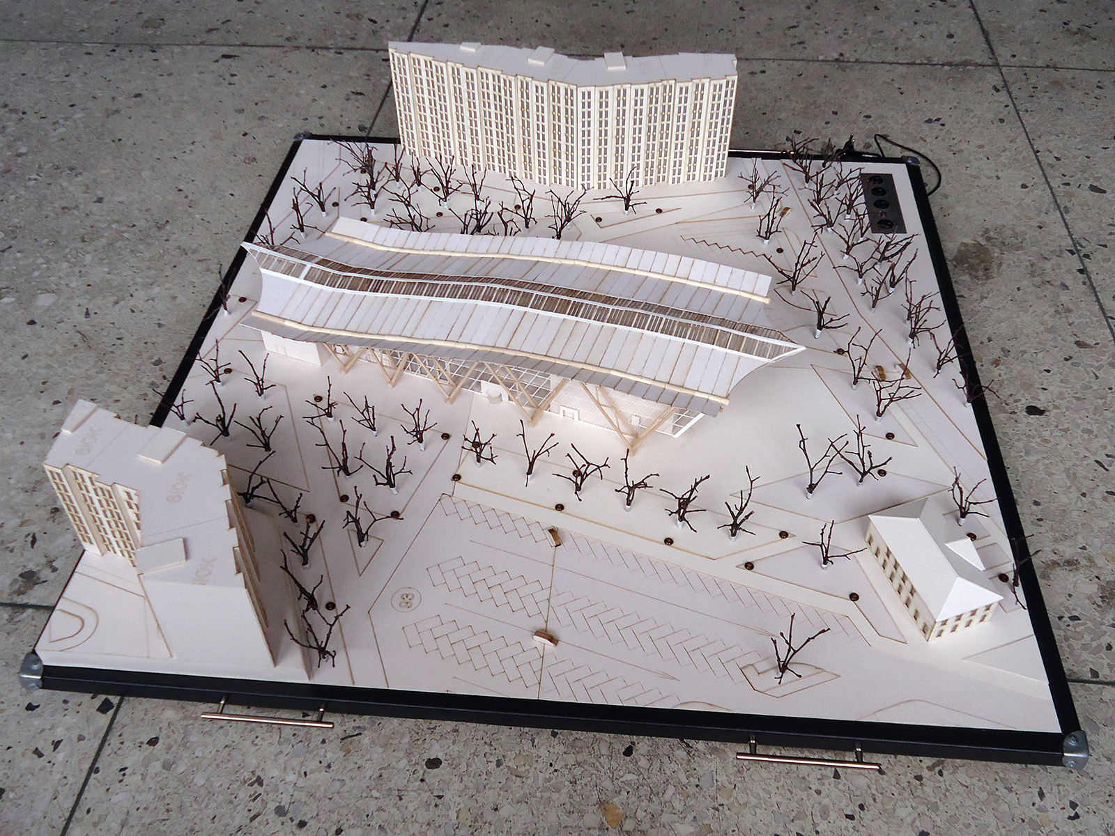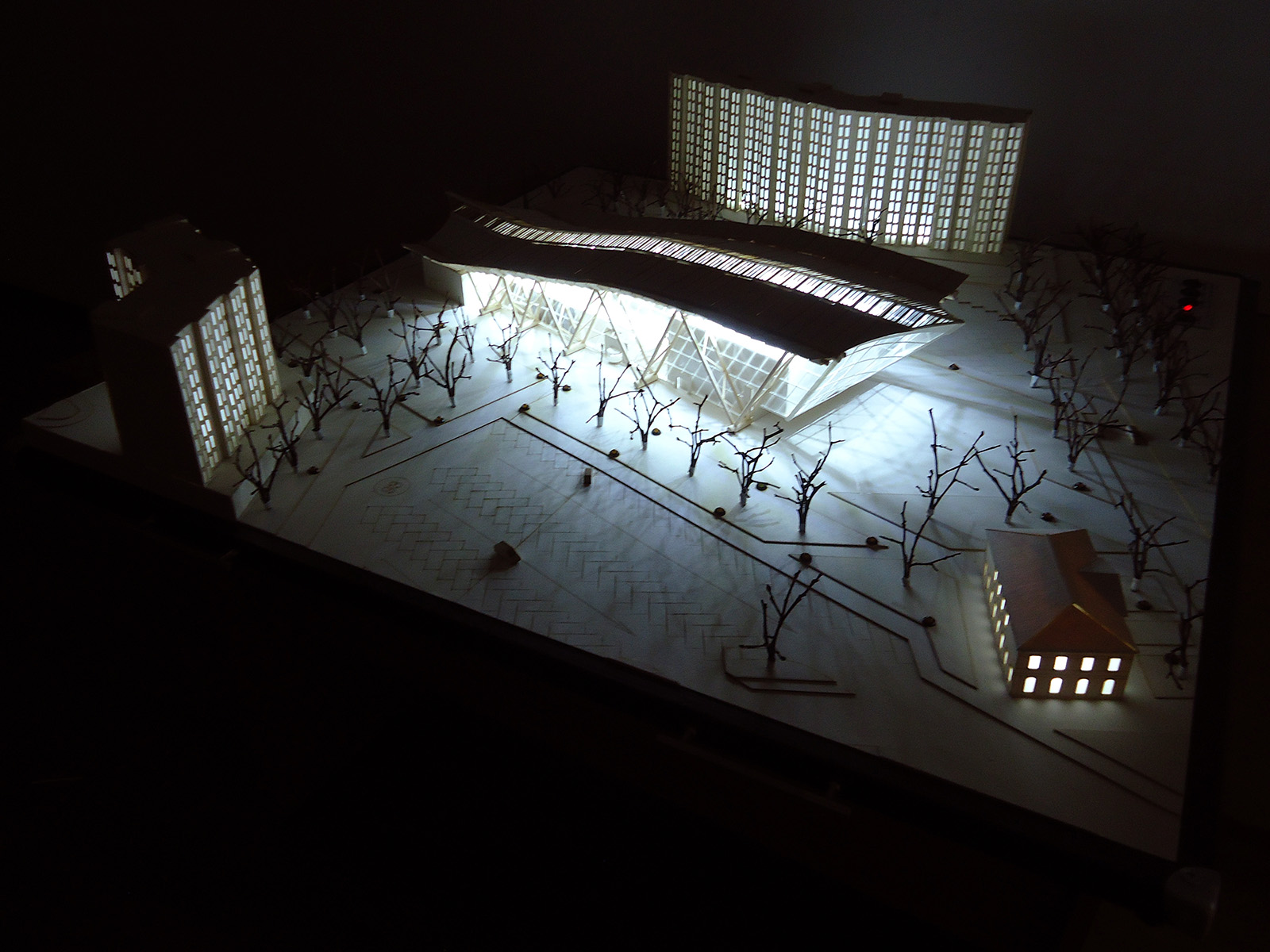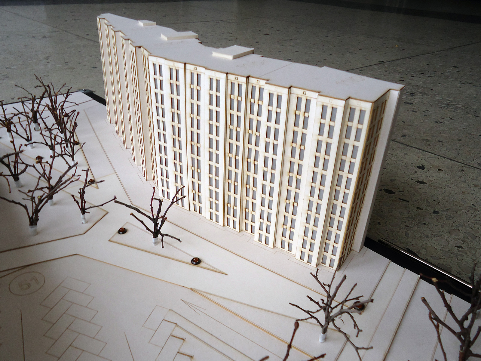 Макет учебного проекта 4 курса. Масштаб 1:200. Строился с апреля по октябрь 2016 года с перерывами. Материал - пивной картон 0,9 мм, много лазерной резки, настоящие ветки деревьев, оргстекло, пленка от файлов, цветная бумага для рисования, калька, термоусадочная трубка, много проводов и светодиодов).