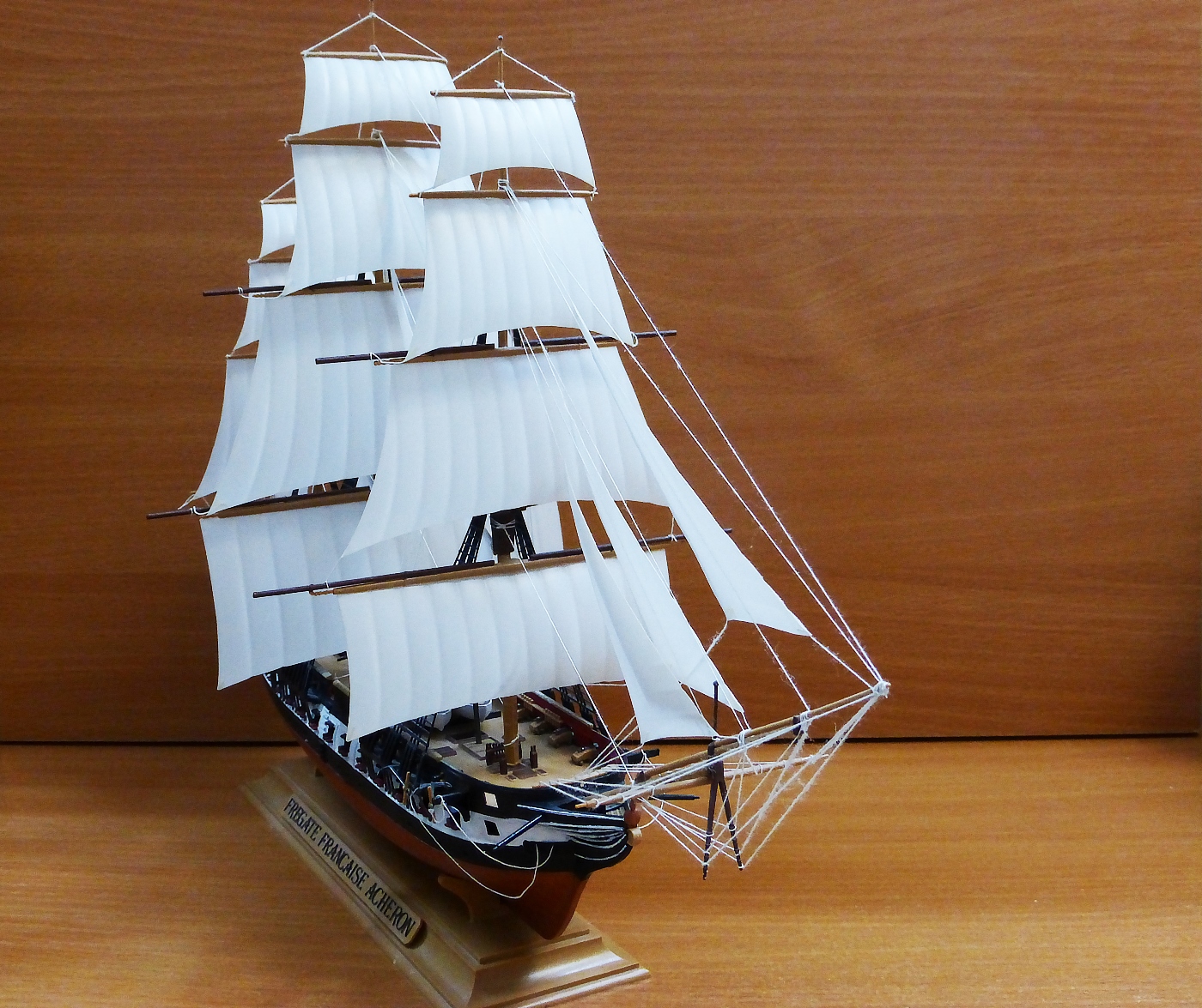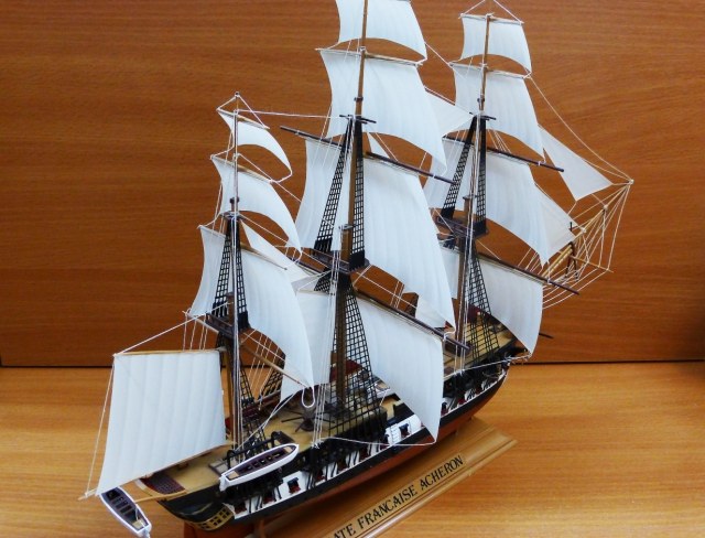 Модель фрегата "Ашерон" собиралась в январе 2012 года, поэтому немного запылилась. На этом масштабе паруса решил не "пришивать" к реям, а просто аккуратно приклеить. Такелаж установлен в соответствии с инструкцией "из коробки". Нитки для такелажа использовались свои, а не те, что были вложены в коробку производителем. Модель раскрашена акриловыми красками от "Тимии" вручную, т.е. кисточками и зубочистками. Как видно, краска за четыре года не потускнела, не выцвела и не облезла. Некоторые делали модели (палуба, частично мачты и реи) не окрашивались, поскольку цвет пластика, из которого они были изготовлены, меня вполне удовлетворял. В целом, получилась достаточно красивая модель, хотя без огрех (изготовителя) тоже не обошлось. Так, например, пришлось довольно основательно подгонять транец кормы.