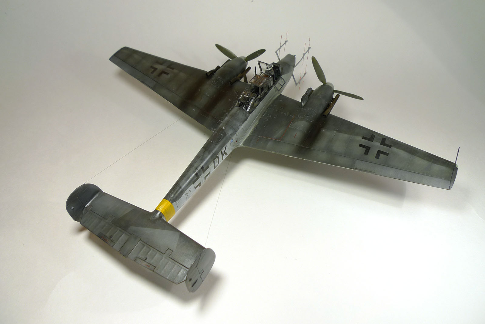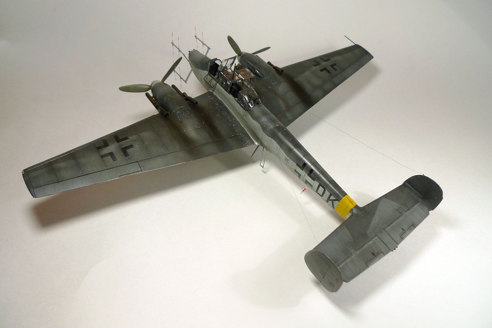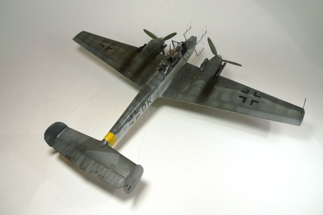 Лично у меня возник вопрос по цветам: камуфляж напоминает скорее американский полутеневой, чем немецкий.Матвей правильно заметил: переход верх-низ на фюзеляже ни в дугу, особенно за кабиной стрелка.Лопасти действительно больно светлые.Цвет пламегасителей...Я так понимаю-это медь, еще и металиком отдает.Если так, то это неправильно. И все-таки свастика на килях должна быть. Я не сторонник фашизма, не дай Бог, но из песни слов не выкинешь и исторически это будет более достоверно.