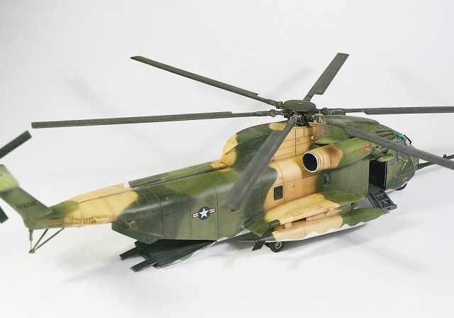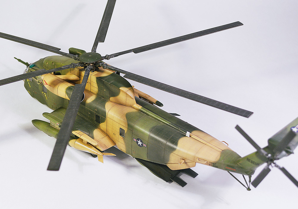 Адекватной модели HH-3E Jolly Green Giant мне больше встречать не доводилось, а вот эта модель HH-53C ждала своего часа еще со времен сборов Московского Клуба Стендового Моделизма в ДК "Компрессор". И уже тогда считалась весьма древним пластиком. Несмотря на это, собиралась вполне не плохо, хотя потребовала обработки некоторых стыков, а так же подгонки остекления. Хотя из доработок, пожалуй, только накатанная клепка. Окраска по маскам из блю така и последующая тонировка масляной краской.