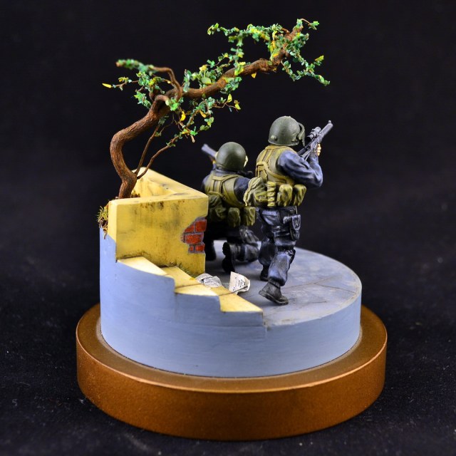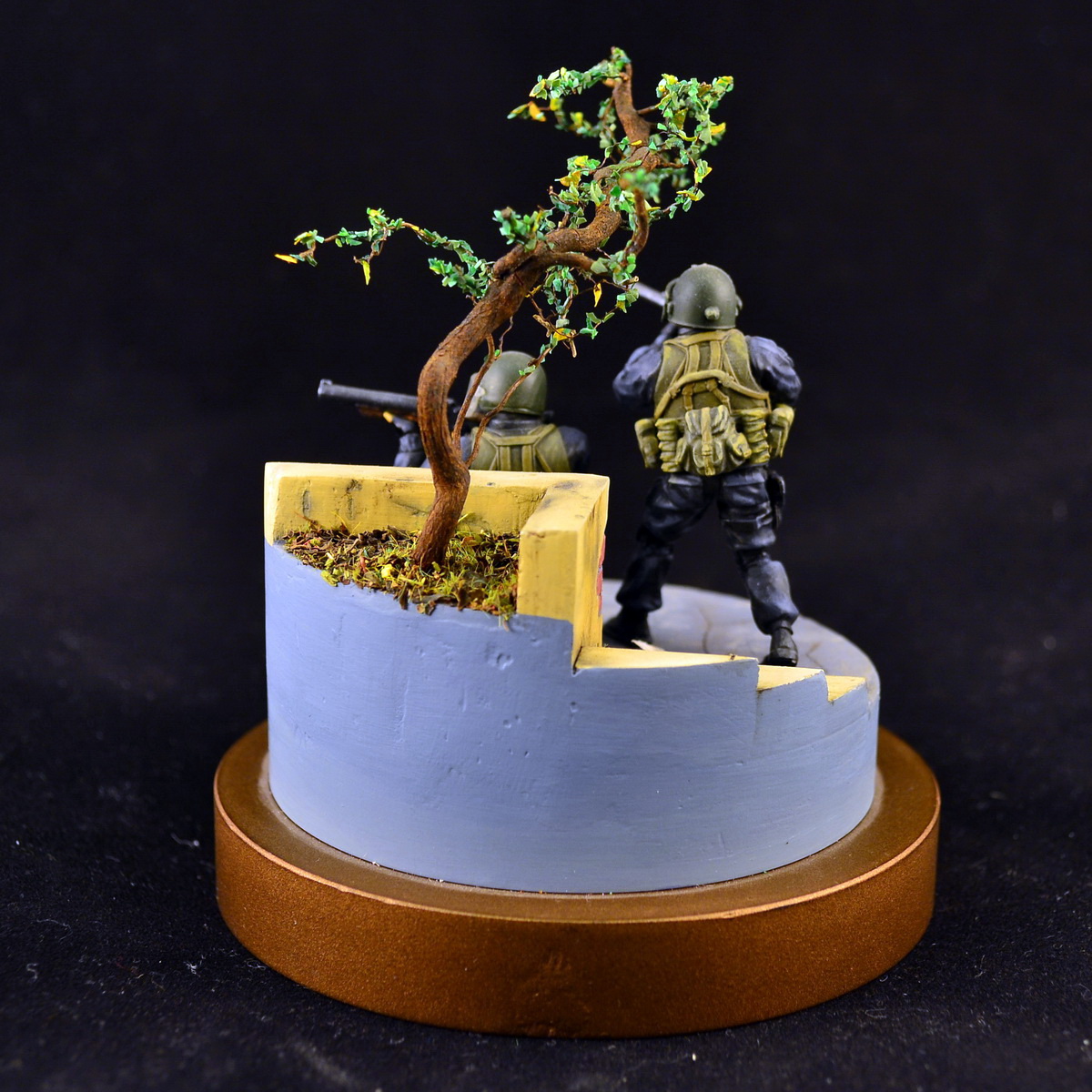 Хороший этот набор у Звезды. Я его четыре раза собирал и красил.)) Мне очень нравиться работа! Может быть выглядит чуть-чуть стерильно.. Наверное из-за ровного асфальта. Какая-нибудь крупная наждачка, хорошо асфальту рельефа придает. Пожухлые листья в траве под деревом классно смотрятся) Они то-же из бумаги? Я сначала подумал, что чай.)) Наверное кошмар было их все, и те что в траве, и те что на дереве, вырезать, а потом высветлять по краям.))