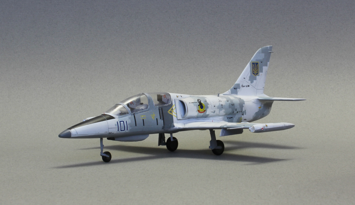Камуфляж выполнен при помощи декали. Кстати, декаль на Aэро L-39 мне понравилась больше чем на Су-25 и МиГ-29. При прочих равных, текстурность печати на ней была наименее заметной, я бы сказал, что ее практически не видно. Плюс в набор входит два варианта камо для крыльев, при чем одни из них производитель подписал как "правильный набор для крыльев". Так же в данном случае опознавательные знаки были отпечатаны вместе со схемой камуфляжа, что позволило избежать проблемы с их просвечиванием, как на предыдущих моделях. Так же в цвета камуфляжа на данной модели не совсем соответствуют прототипу. Они кажутся светлее. Это связано с тем что базовый цвет модели под декалью почти белый.