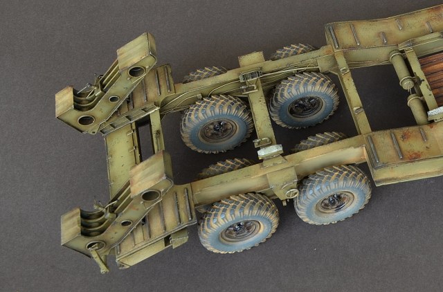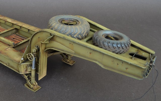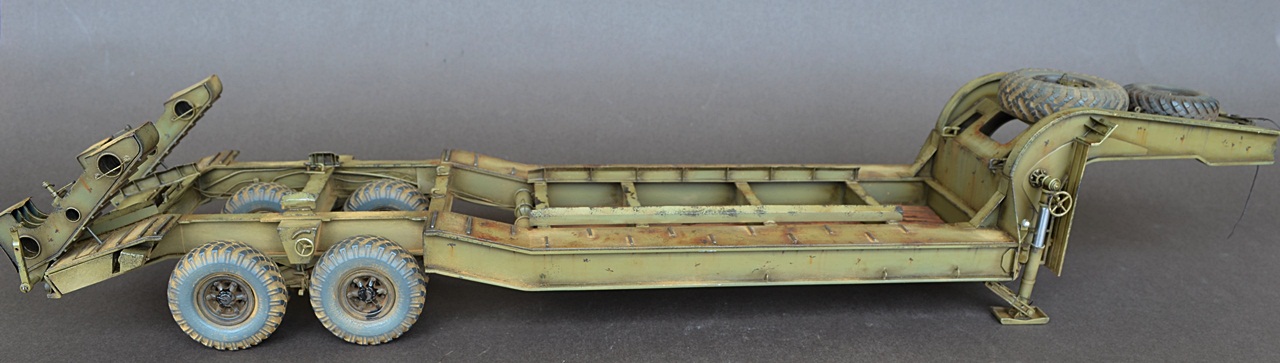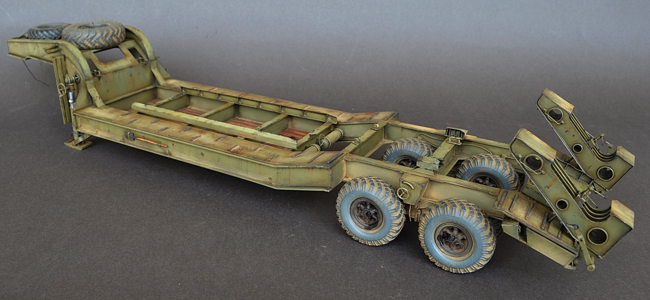 - В полуприцепе доработак меньше чем в тягаче.Добавил немного проводки и сделал тормозную систему.Поршни и цилиндры обор изготовил заново и сделал их рабочими.Под гусаком оси опор соединил поперечной штангой.Переделал винт фиксирующий трапы.Доски сделал из клееного шпона.Добавил лопату.Опорную поверхность трапов(которая опирается на грунт)заменил на жестяную и немного погнул.Колеса,а точнее шины взял от Кастомфактори а обода оставил родные.Фигурки от ICM,танк от Meng.