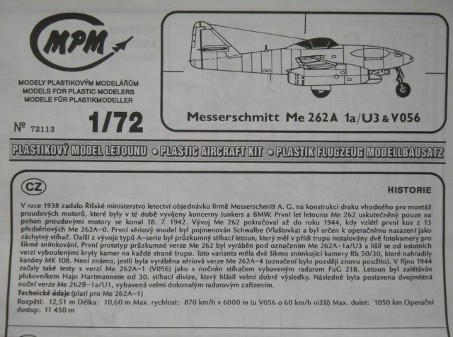 P.S.: Модель давно не производится. На сегодняшний день она, пожалуй, утеряла свою актуальность. С тех пор появилось немало неплохих моделей Me 262 от разных производителей, в том числе и конкретно A-1a/U3 от Revell. Что же касается V056, то его можно переделать самостоятельно, на основе какого-то из существующих наборов, при наличии интереса к этой модификации, естественно.