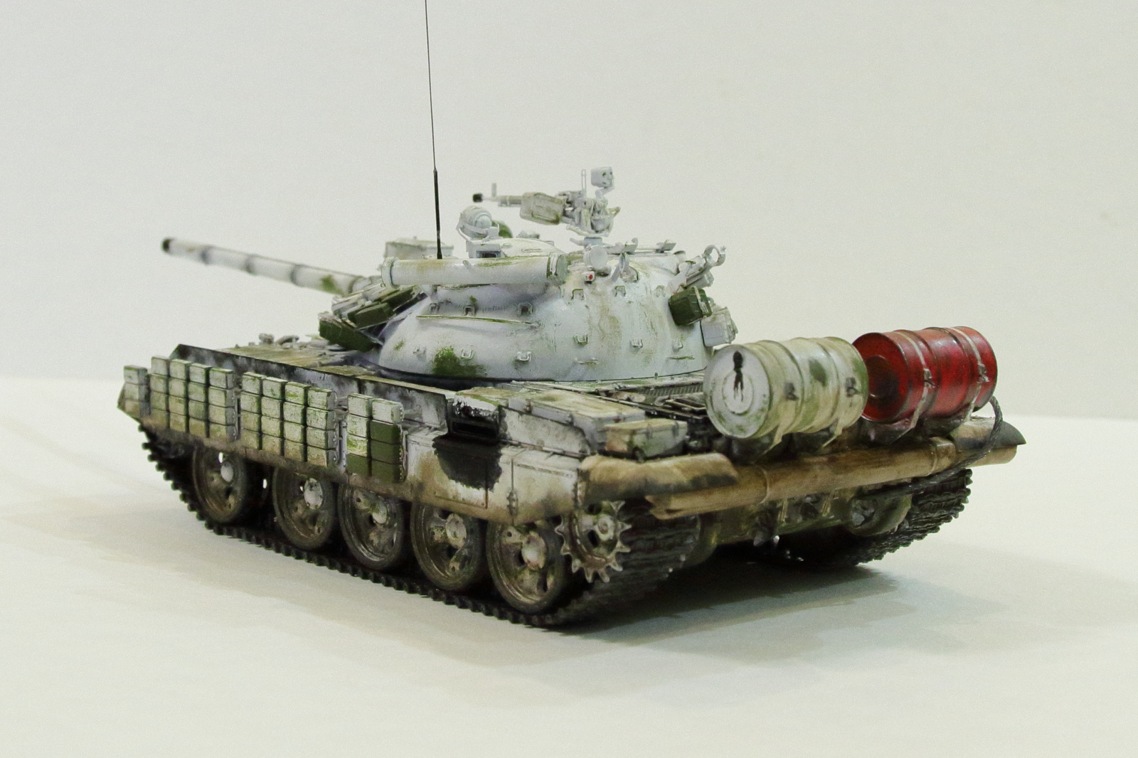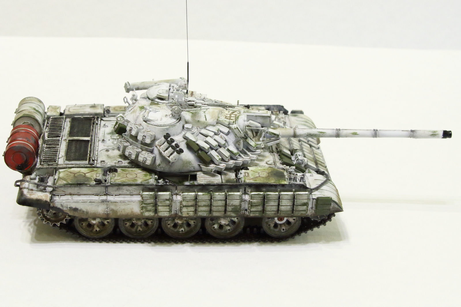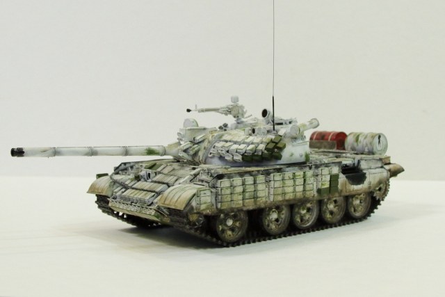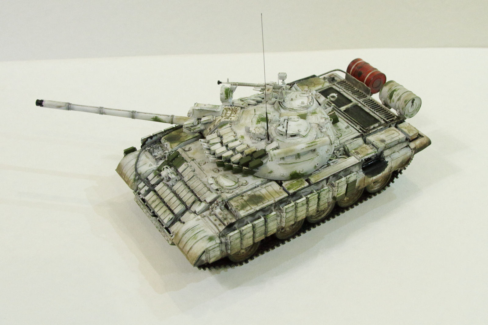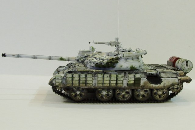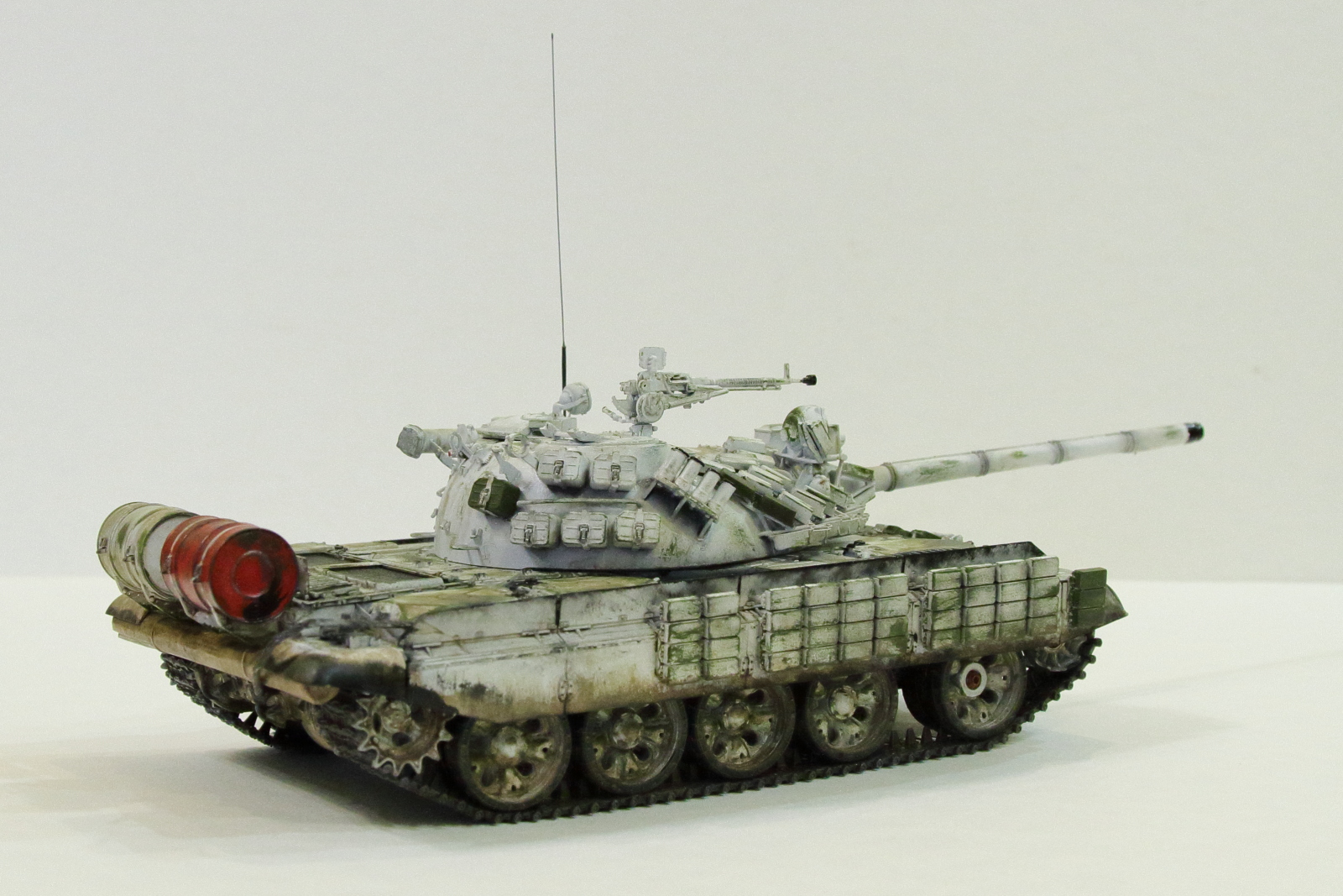 Мне надоели зеленые или пятнисто зеленые танки. И решил я, хочу танк в зимний камуфляже, да не в простом, а замученном жизнью. Найти полностью "белый камуфляж" для танка 80-х годов прошлого века мне не удалось. Нашел наставления 50-х годов где чисто белый цвет разбавлялся зелеными пятнами. Хотя чисто белый цвет допускался...но...далее, моя фантазия на тему: "Сказано - сделано". По легенде: окрасили осенью, и до весны гоняли по полигонам и стрельбище. Ходовая извазюкалась, белый цвет стал сходить...одну бочку потеряли, пришлось у прапорщика взять, что было...контейнеры ДЗ...а, так их на момент окраски в белый цвет не было на танке, потом установили.