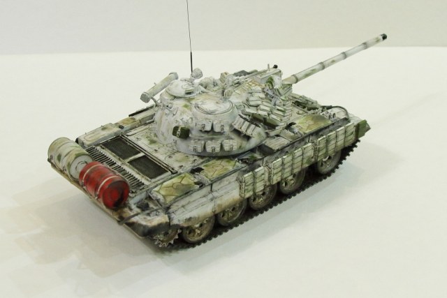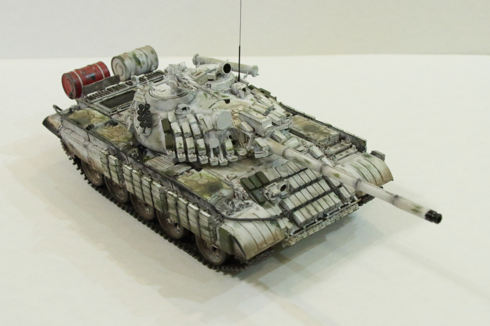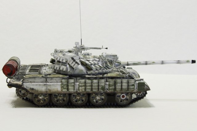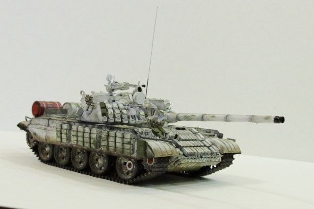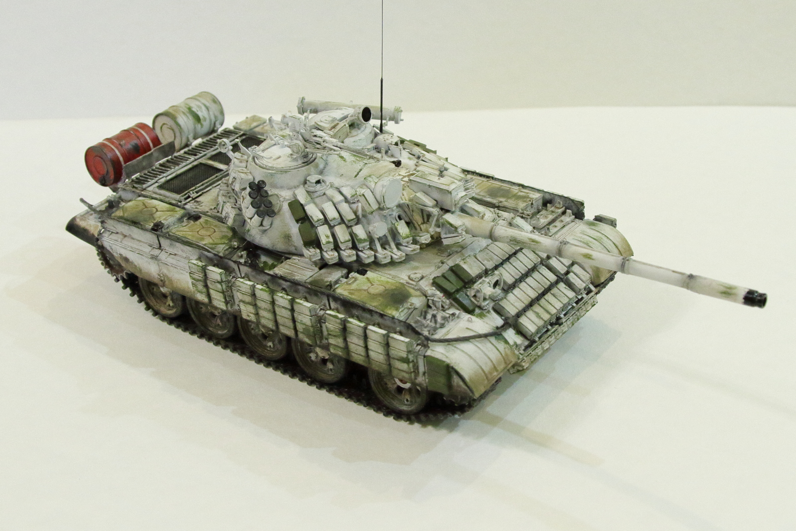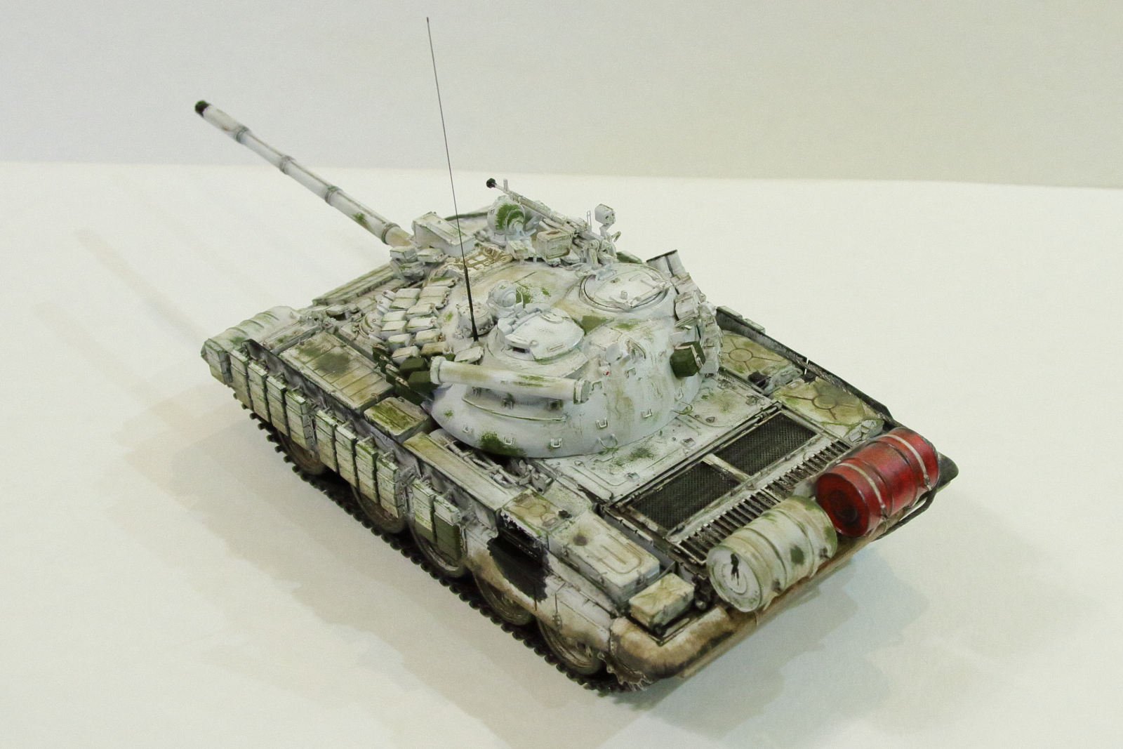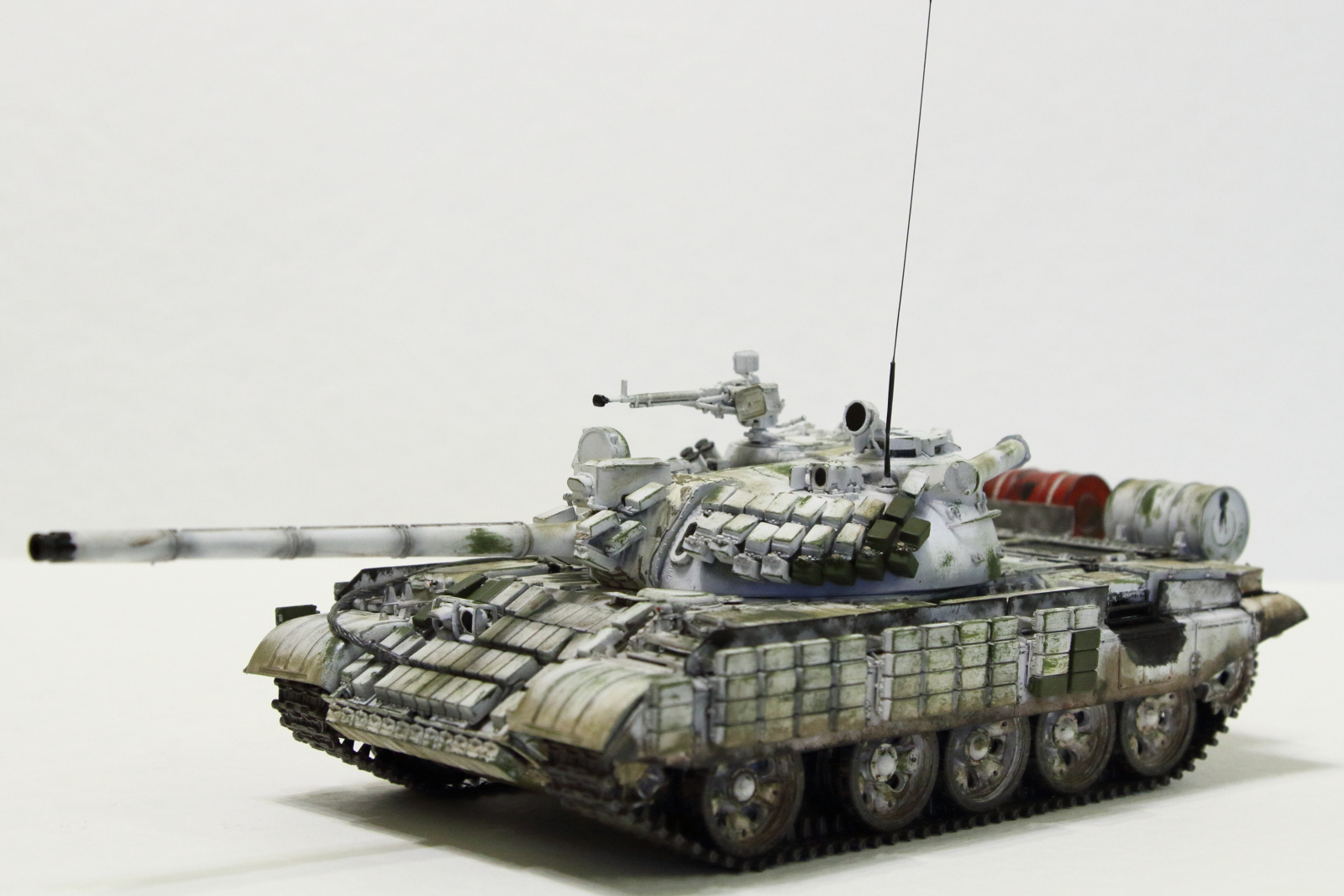 Мне надоели зеленые или пятнисто зеленые танки. И решил я, хочу танк в зимний камуфляже, да не в простом, а замученном жизнью. Найти полностью "белый камуфляж" для танка 80-х годов прошлого века мне не удалось. Нашел наставления 50-х годов где чисто белый цвет разбавлялся зелеными пятнами. Хотя чисто белый цвет допускался...но...далее, моя фантазия на тему: "Сказано - сделано". По легенде: окрасили осенью, и до весны гоняли по полигонам и стрельбище. Ходовая извазюкалась, белый цвет стал сходить...одну бочку потеряли, пришлось у прапорщика взять, что было...контейнеры ДЗ...а, так их на момент окраски в белый цвет не было на танке, потом установили.