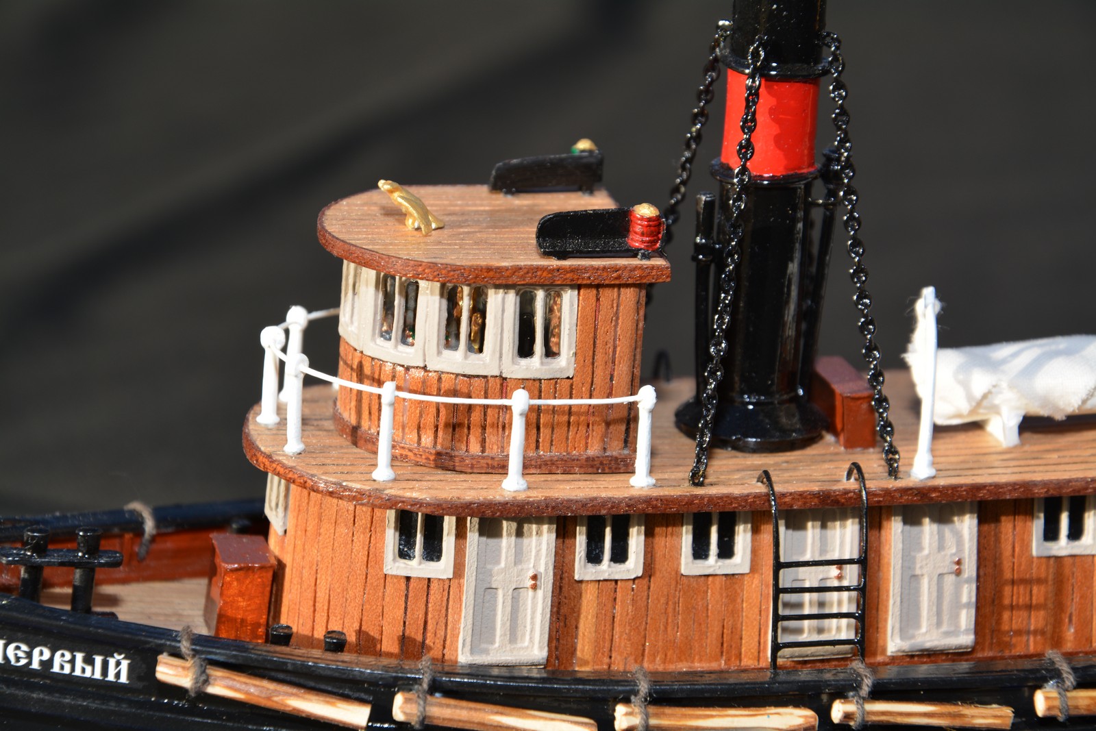 - не хватает такелажа на мачте, ну не может мачта стоять сама по себе, на фотографии буксира видны стяжки которыми она крепится;